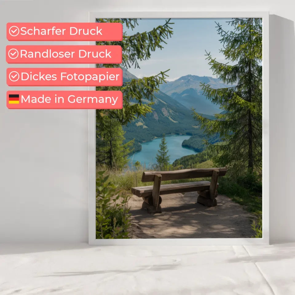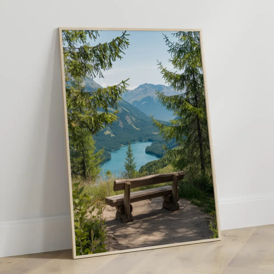 Entdecken Sie unser atemberaubendes Poster Naturlandschaft mit Holzbank und türkisfarbenem See. Dieses wunderschöne Wandbild bringt die Ruhe der Natur in Ihr Zuhause und lässt Sie von unvergesslichen Momenten an einem ruhigen See träumen. Die rustikale Holzbank, die auf einem malerischen Pfad platziert ist, lädt zum Verweilen ein und schafft eine harmonische Verbindung zur umgebenden Natur.