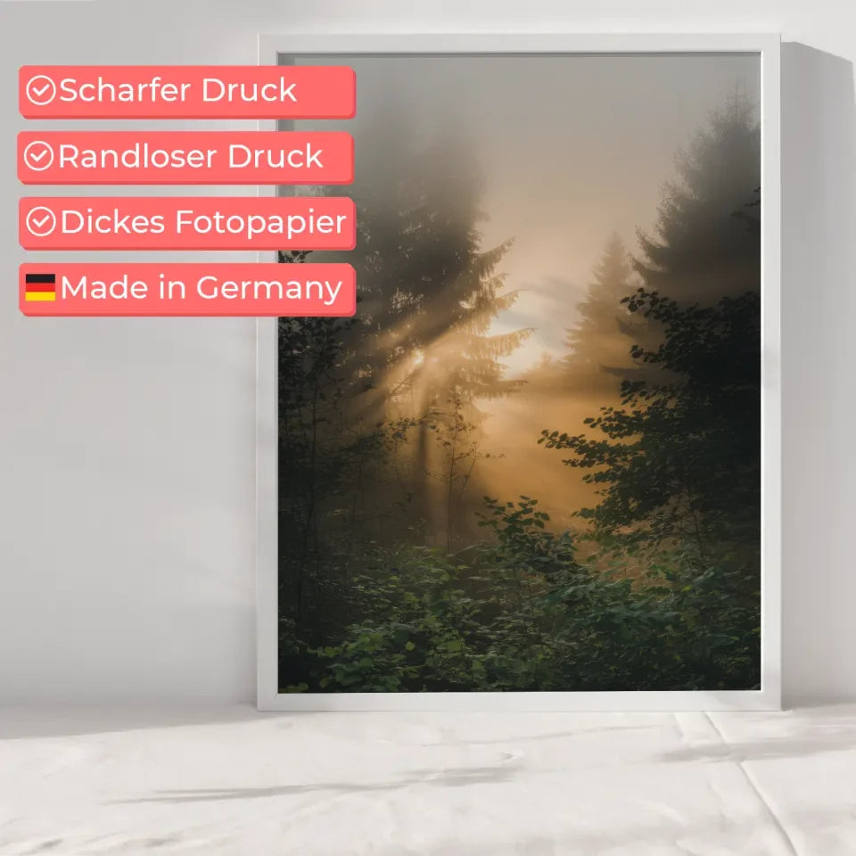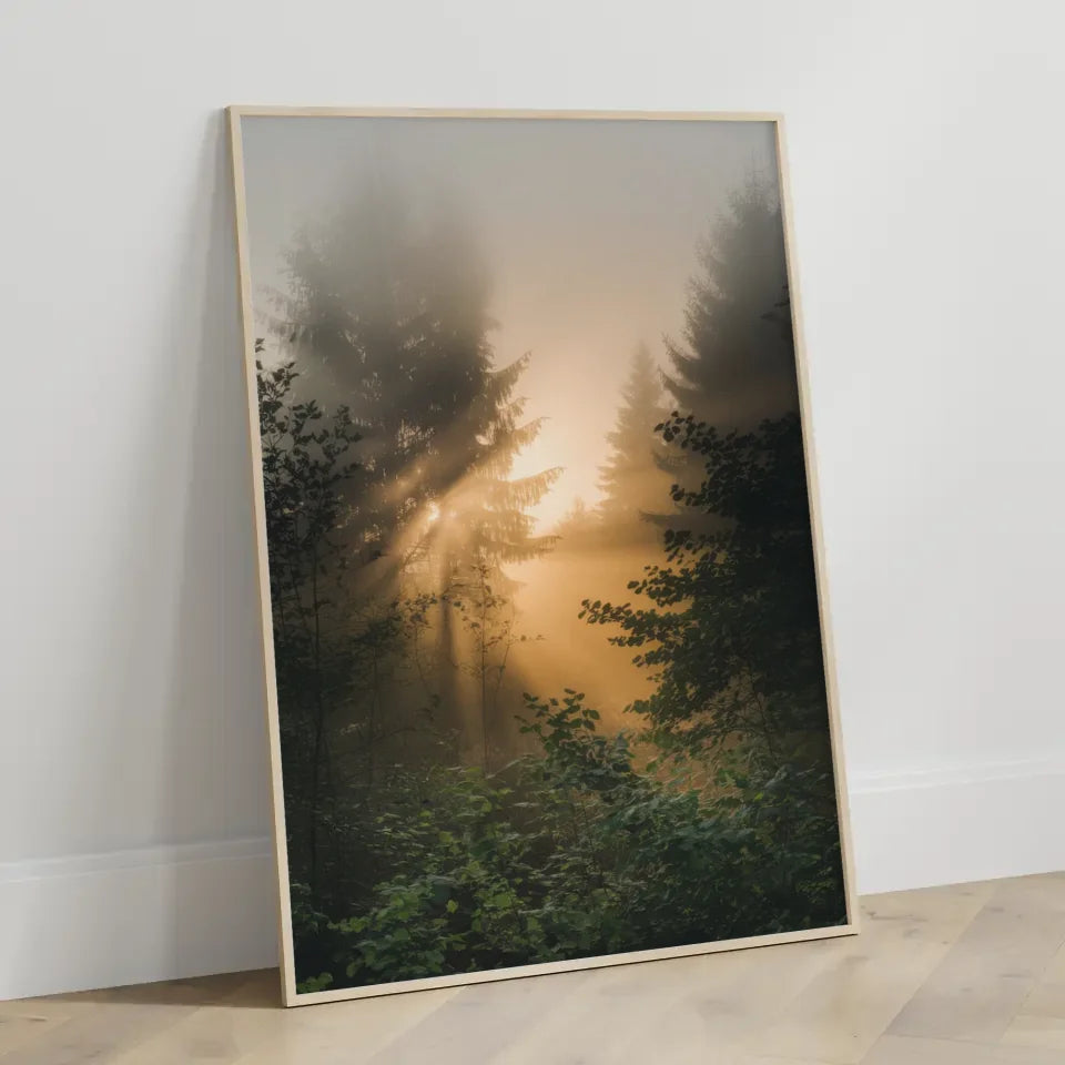 Dieses Poster ist nicht nur ein Blickfang, sondern auch eine Einladung zur Entspannung und zur Flucht aus dem hektischen Alltag. Bringen Sie die Ruhe und das Licht dieses nebligen Sonnenaufgangs in Ihre vier Wände und lassen Sie sich von der natürlichen Schönheit verzaubern.