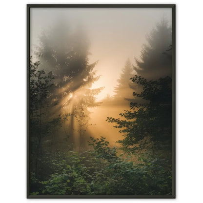Poster nebliger Sonnenaufgang im Wald mit goldenem Licht und Grün