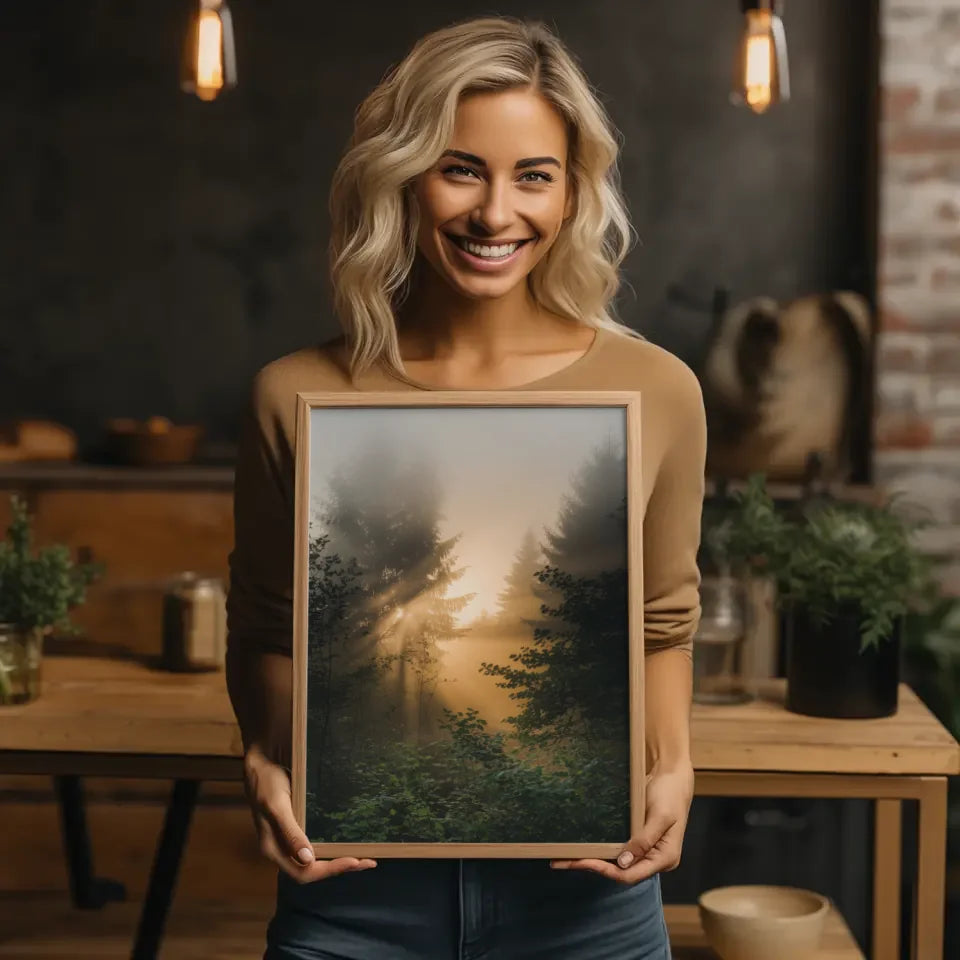 Entdecken Sie unser beeindruckendes Poster nebliger Sonnenaufgang im Wald mit goldenem Licht und Grün, das die Magie eines herbstlichen Morgens in Ihr Zuhause bringt. Dieses besondere Poster fängt den einzigartigen Moment ein, wenn der Nebel über den Baumwipfeln schwebt und die ersten Sonnenstrahlen den Wald in ein warmes, goldenes Licht tauchen.