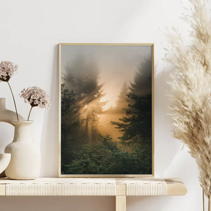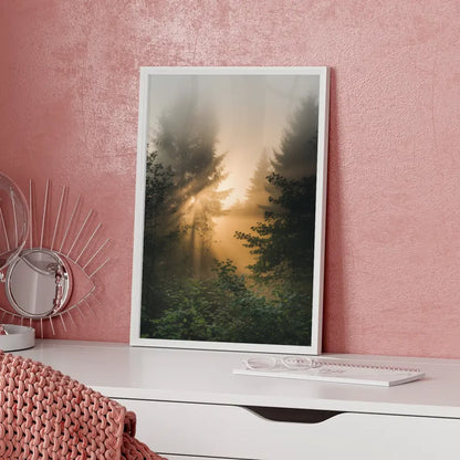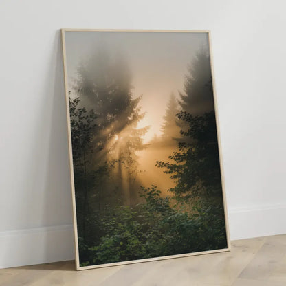 Gestalten Sie Ihr Zuhause individuell mit unserem Poster nebliger Sonnenaufgang im Wald mit goldenem Licht und Grün und genießen Sie die beruhigende Wirkung der Naturkunst an Ihren Wänden.