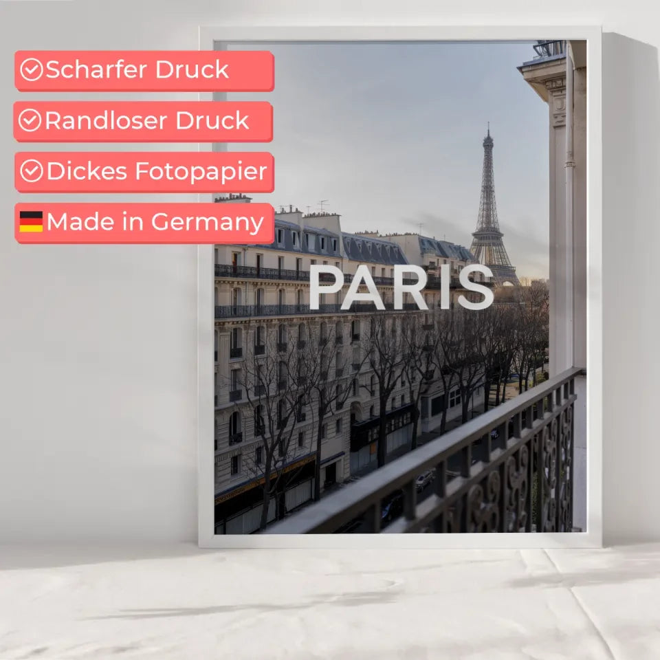 Das Eiffel Tower Poster Paris Panorama besticht nicht nur durch seine Ă€sthetische Schönheit, sondern auch durch die besondere Komposition, die das berĂŒhmte BalkongelĂ€nder und die kunstvollen Fassaden der GebĂ€ude in den Vordergrund rĂŒckt. Dieses Wandbild ist eine hervorragende Wahl fĂŒr alle, die Paris lieben und ihre WĂ€nde mit kulturellen Highlights dekorieren möchten. Die stilvolle Schriftart des Wortes 'PARISâ in Fettschrift verleiht dem Poster eine zusĂ€tzliche Note der Eleganz und unterstreicht die IdentitĂ€t dieser einzigartigen Stadt.