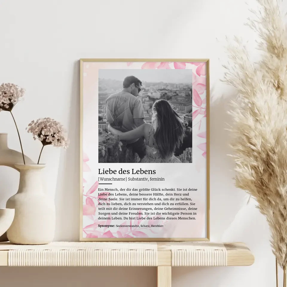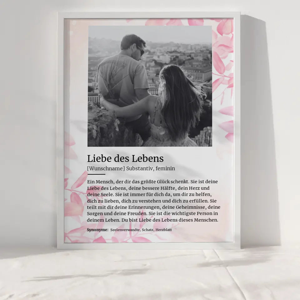 Du möchtest etwas einzigartiges verschenken? Dann ist unser Poster personalisiert Definition Liebe des Lebens Mit Name das perfekte personalisierbare Geschenk.