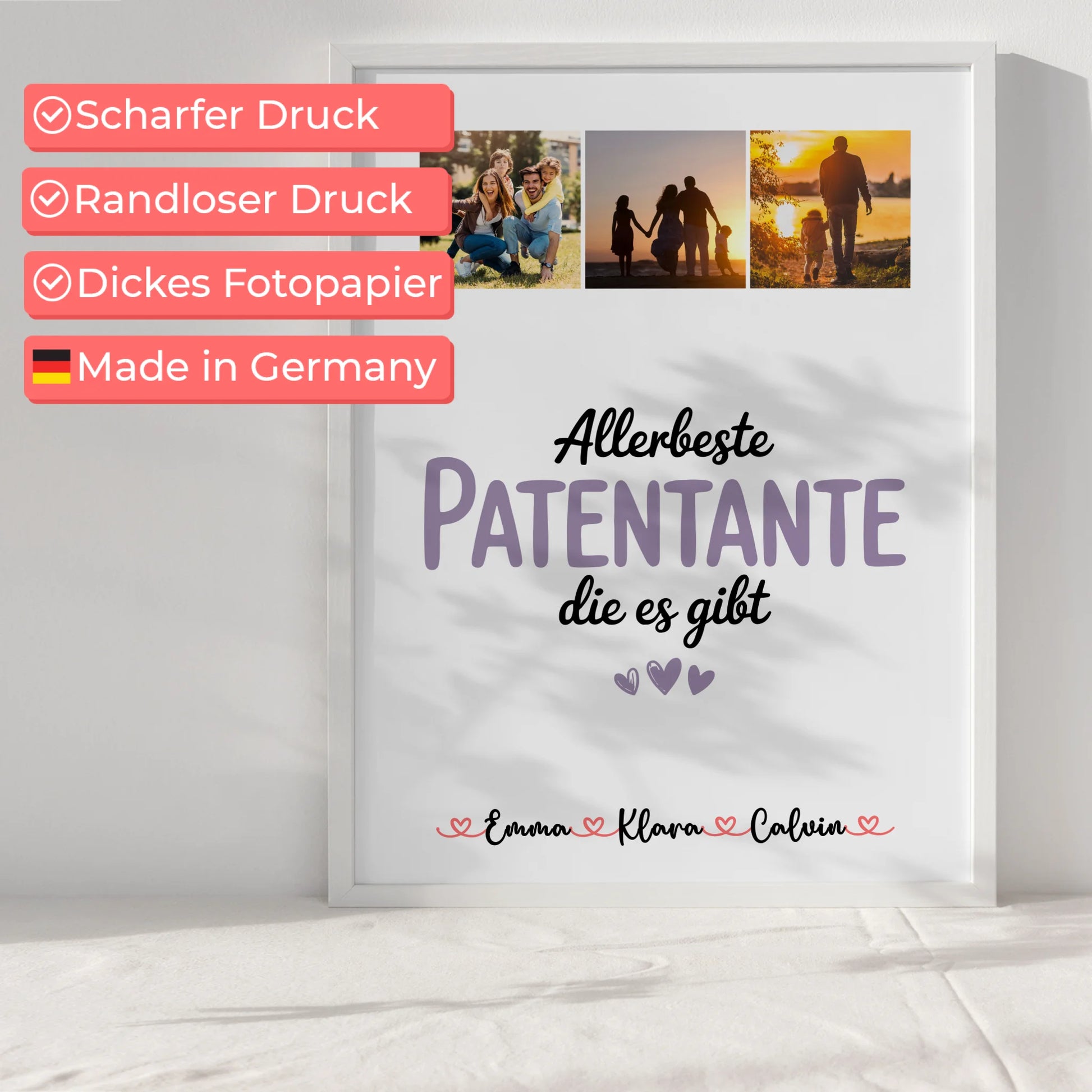 Dieses personalisierte Poster ist eine liebevolle Aufmerksamkeit für deine Patentante und zeigt ihr, wie wichtig sie dir ist. Mit dem einzigartigen Design und der persönlichen Note wird das Poster Personalisiert Fotocollage Patentante Allerbeste Patentante Die Es Gibt Geschenk garantiert zum Highlight in jedem Zuhause. Überrasche deine Patentante mit einer individuellen Fotocollage, die von Herzen kommt!