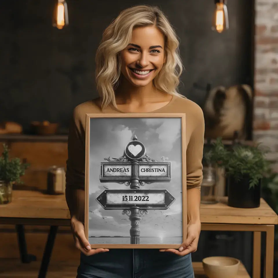 Poster personalisiert Wegweiser Meer Schwarz Weiß mit Namen & Datum
