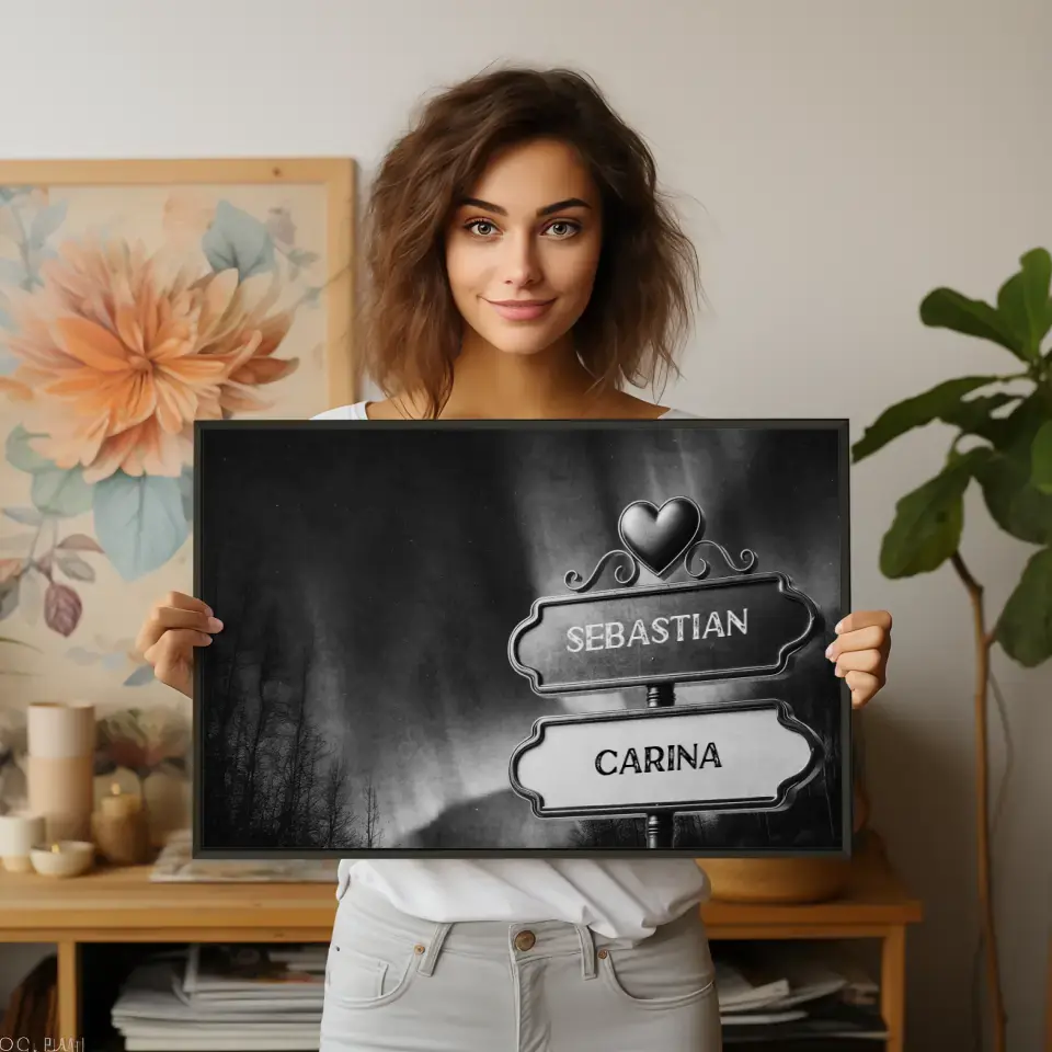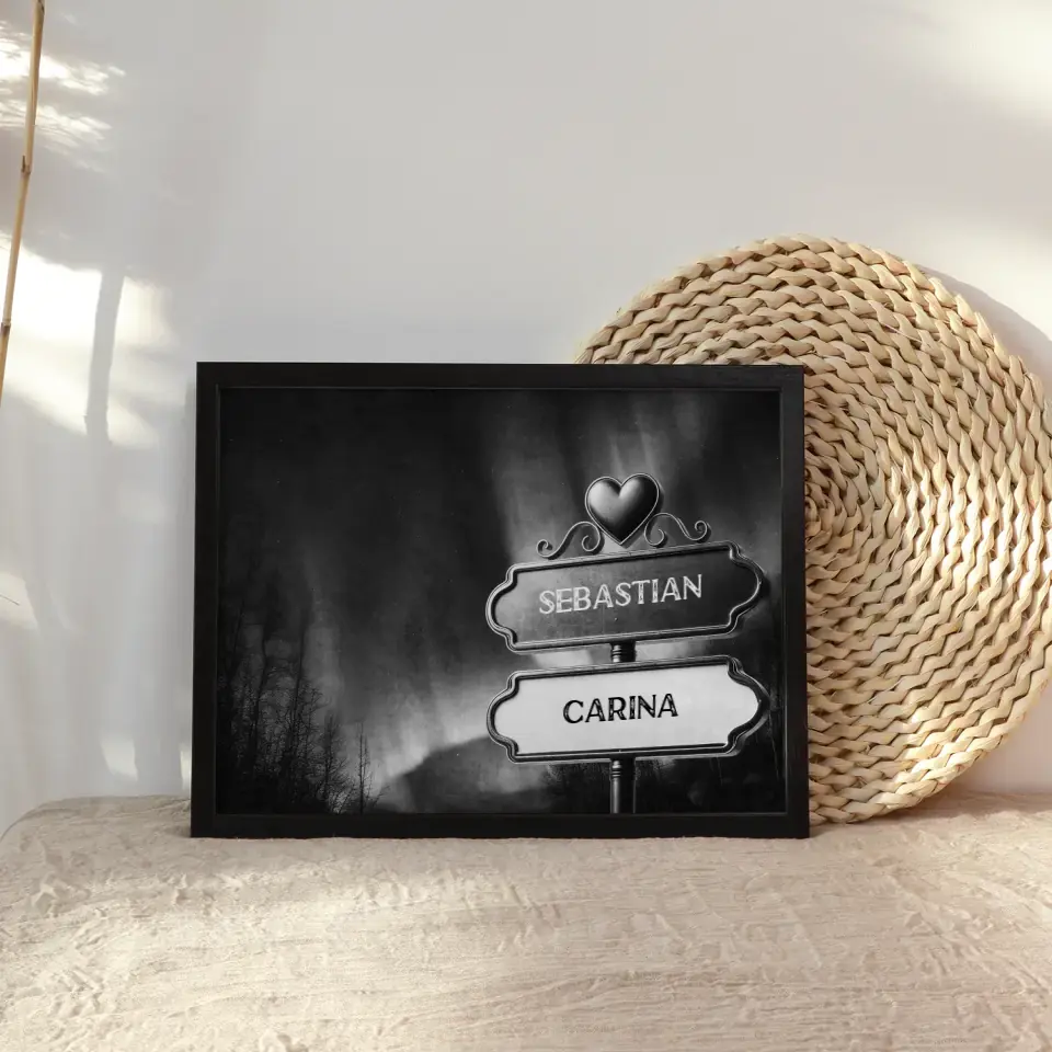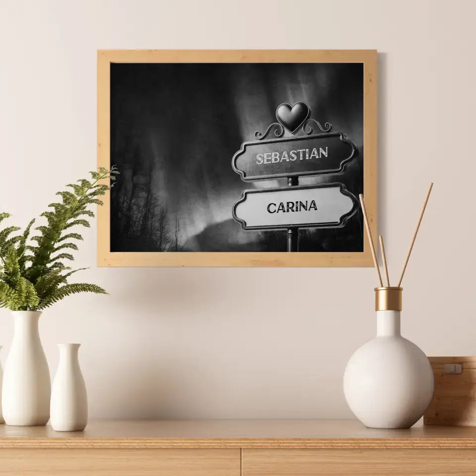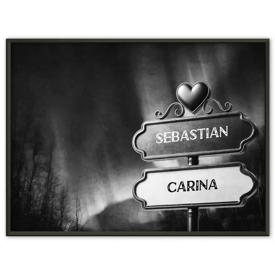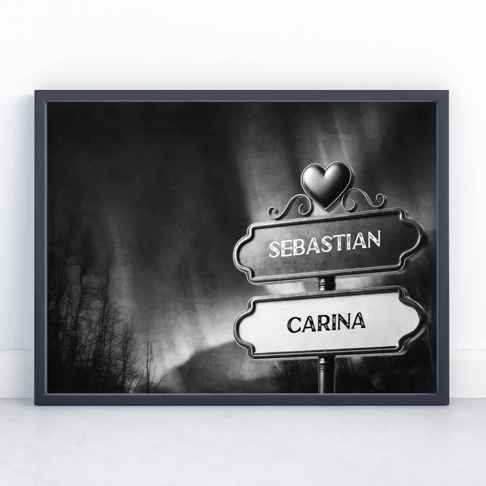 Poster personalisiert Wegweiser Schwarz Weiß Polarlichter mit Namen