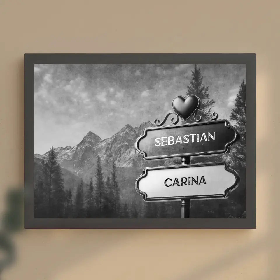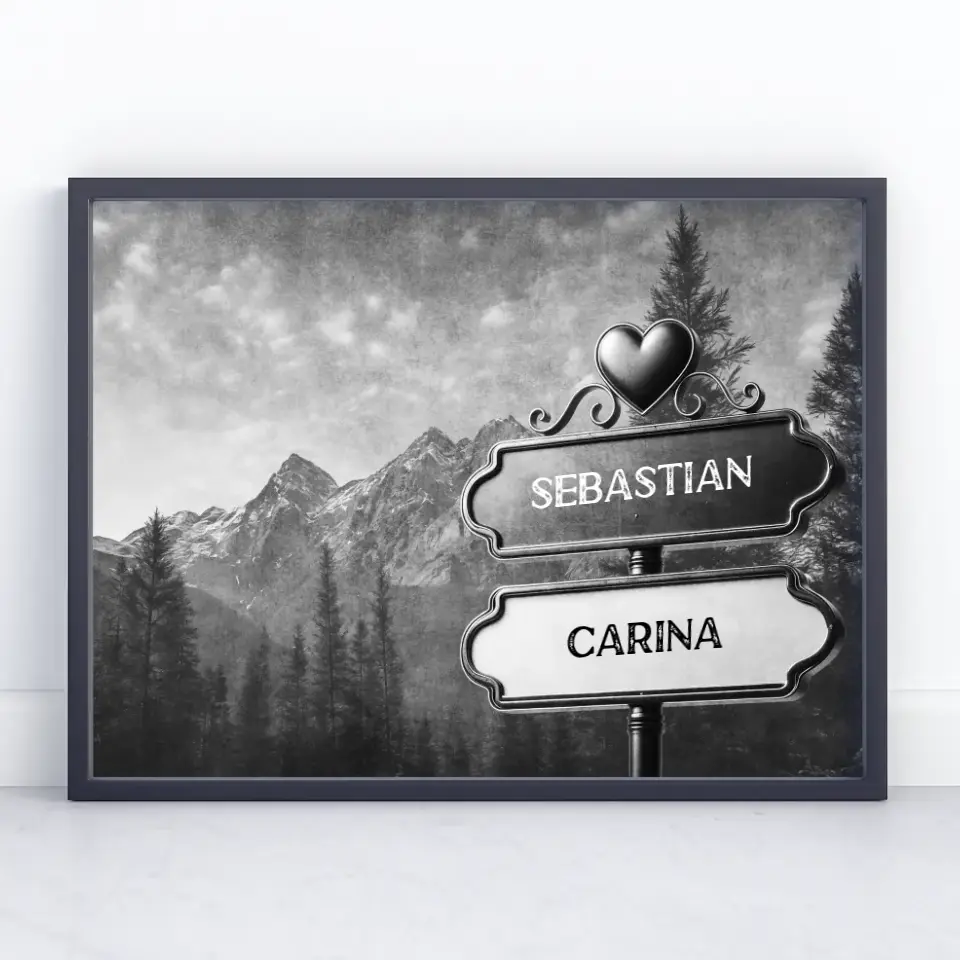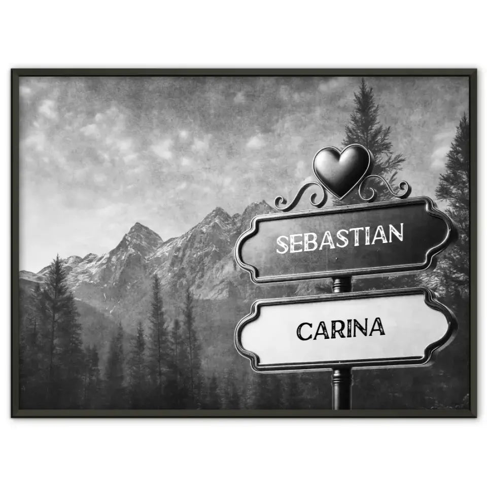 Poster personalisiert Wegweiser Schwarz Weiß Wald Berge mit Namen