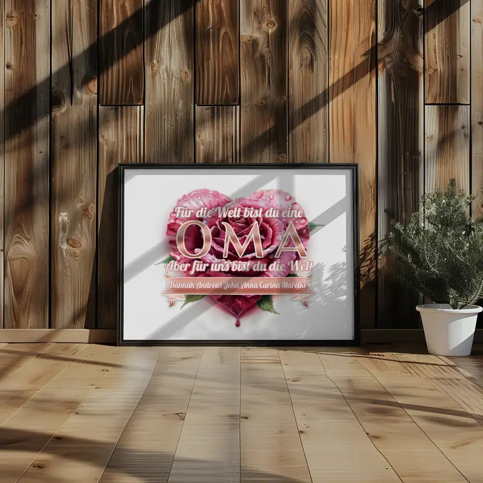Du möchtest etwas einzigartiges verschenken? Dann ist Unser Poster Rosenherz für Oma Du bist unsere Welt ein perfektes und super schönes personalisiertes Geschenk.