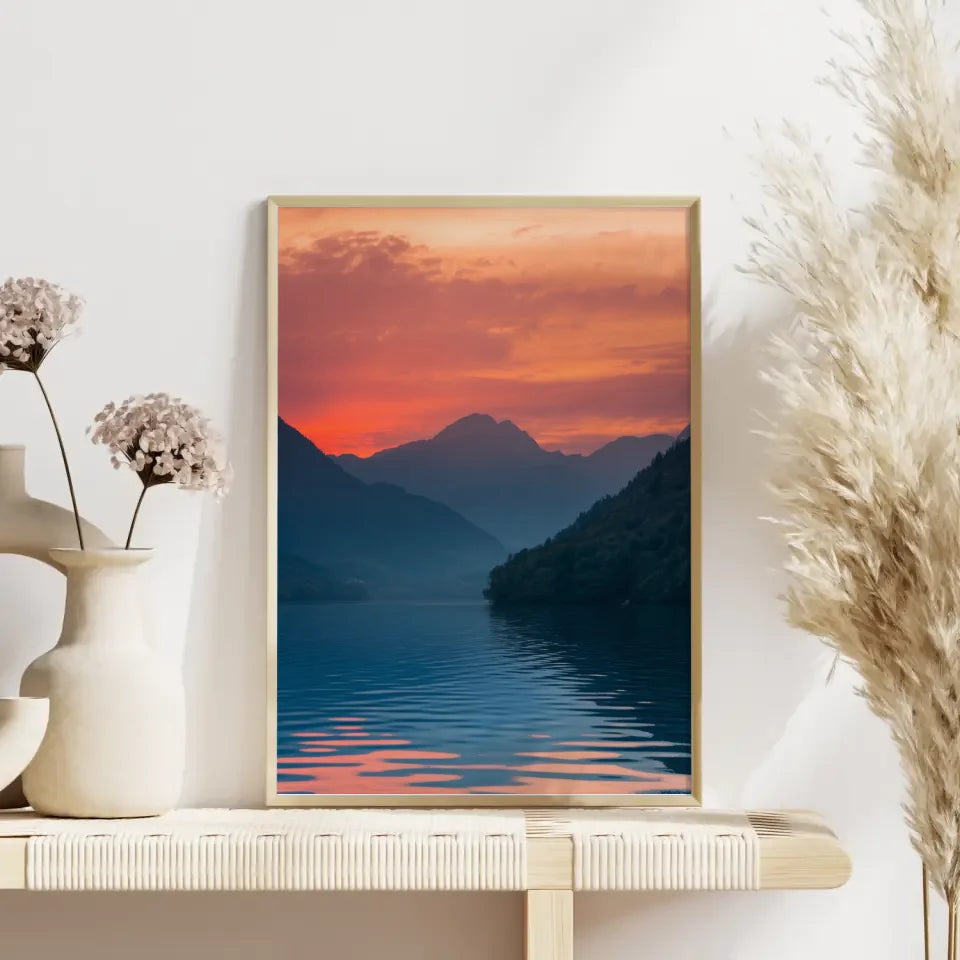 Das Poster Sonnenaufgang am See ist nicht nur ein dekoratives Element, sondern auch eine Einladung, die Schönheit der Natur in Ihr Zuhause zu bringen. Die lebendigen Farben und die detailreiche Darstellung schaffen eine beruhigende Stimmung und sorgen für ein harmonisches Ambiente. Dieses Kunstwerk ist die perfekte Wahl, um Gemütlichkeit in Ihr Zuhause zu zaubern.
