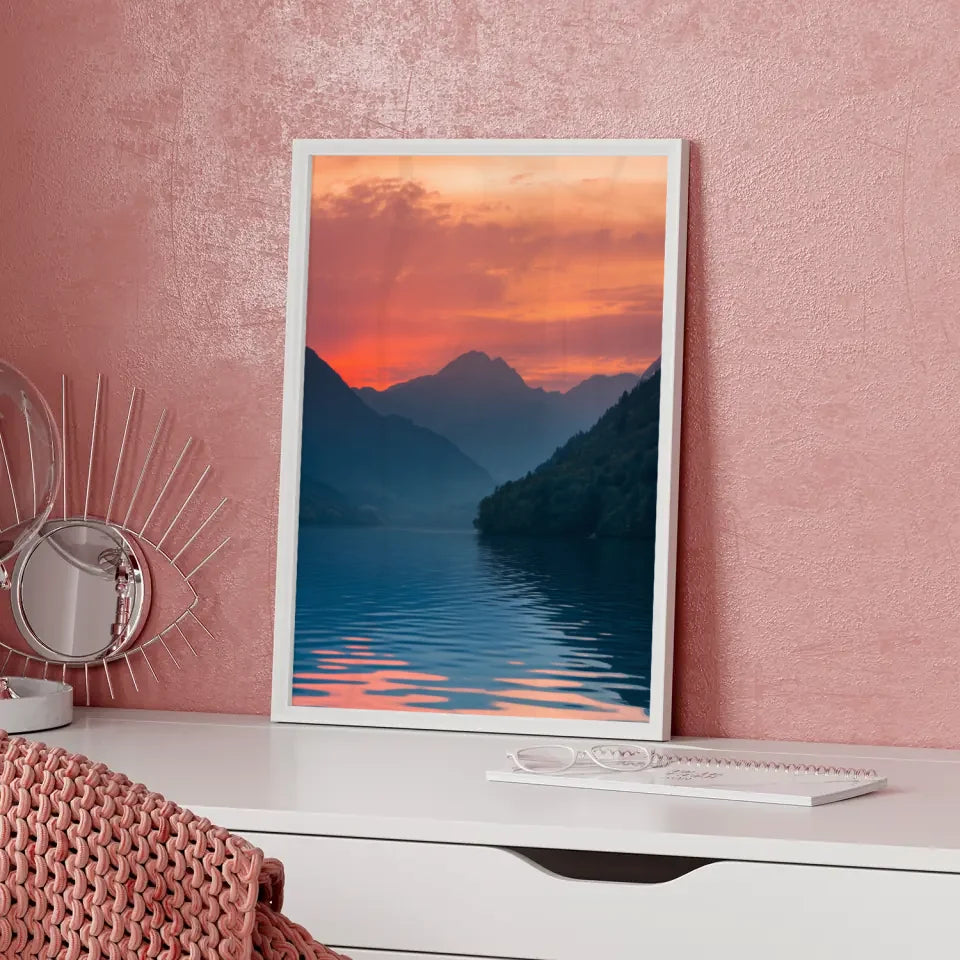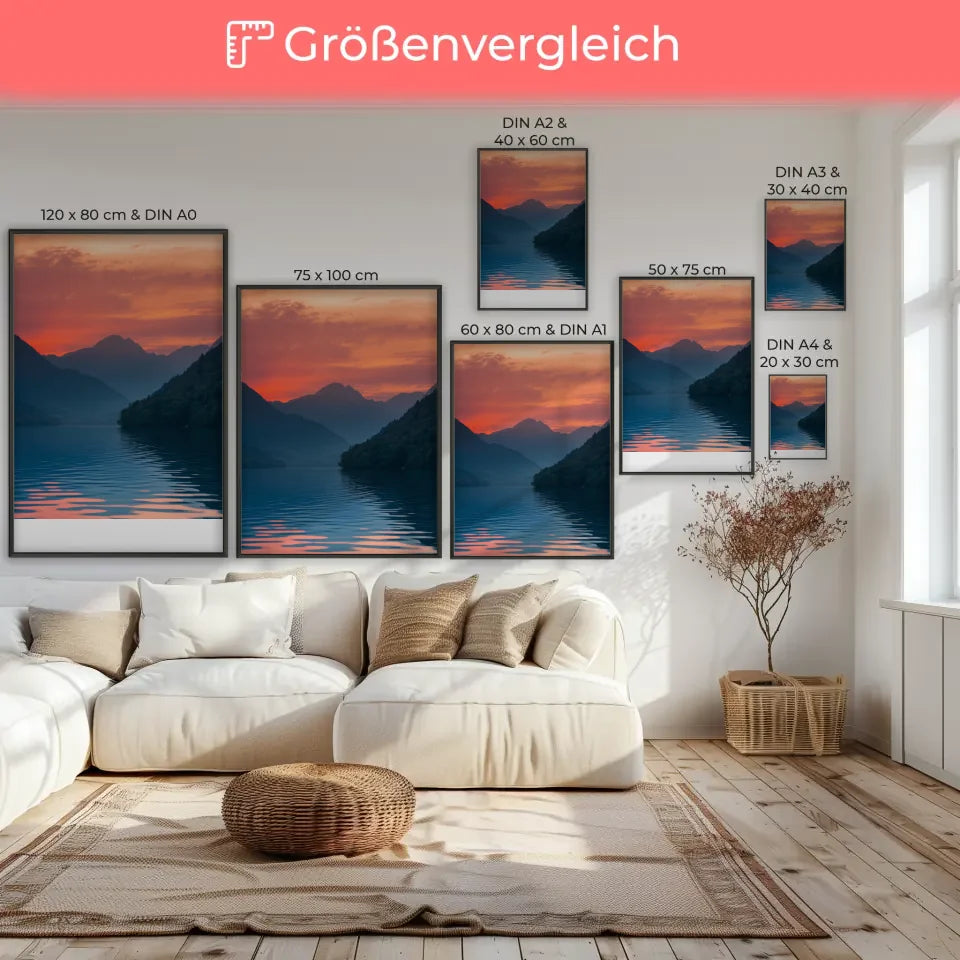 Verleihen Sie Ihrem Raum mit unserem beeindruckenden Poster Sonnenaufgang am See eine magische Atmosphäre. Dieses bezaubernde Naturposter zeigt einen spektakulären Sonnenaufgang über einem ruhigen See und bringt ein Gefühl von Frieden und Harmonie in jeden Raum. Ideal für Wohnräume, Büros oder als Geschenk für Naturfreunde – dieses Poster ist ein echter Hingucker.