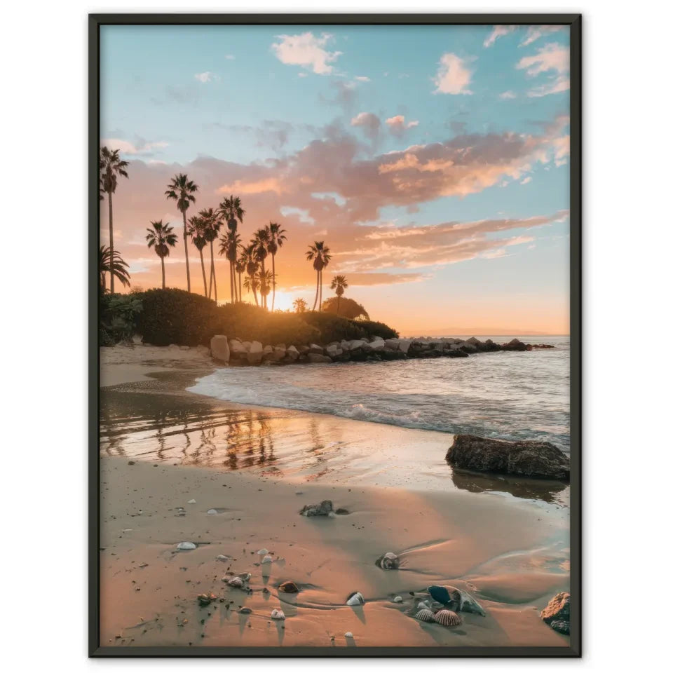 Poster Sonnenuntergang am Strand in Kalifornien mit Palmen und Muscheln
