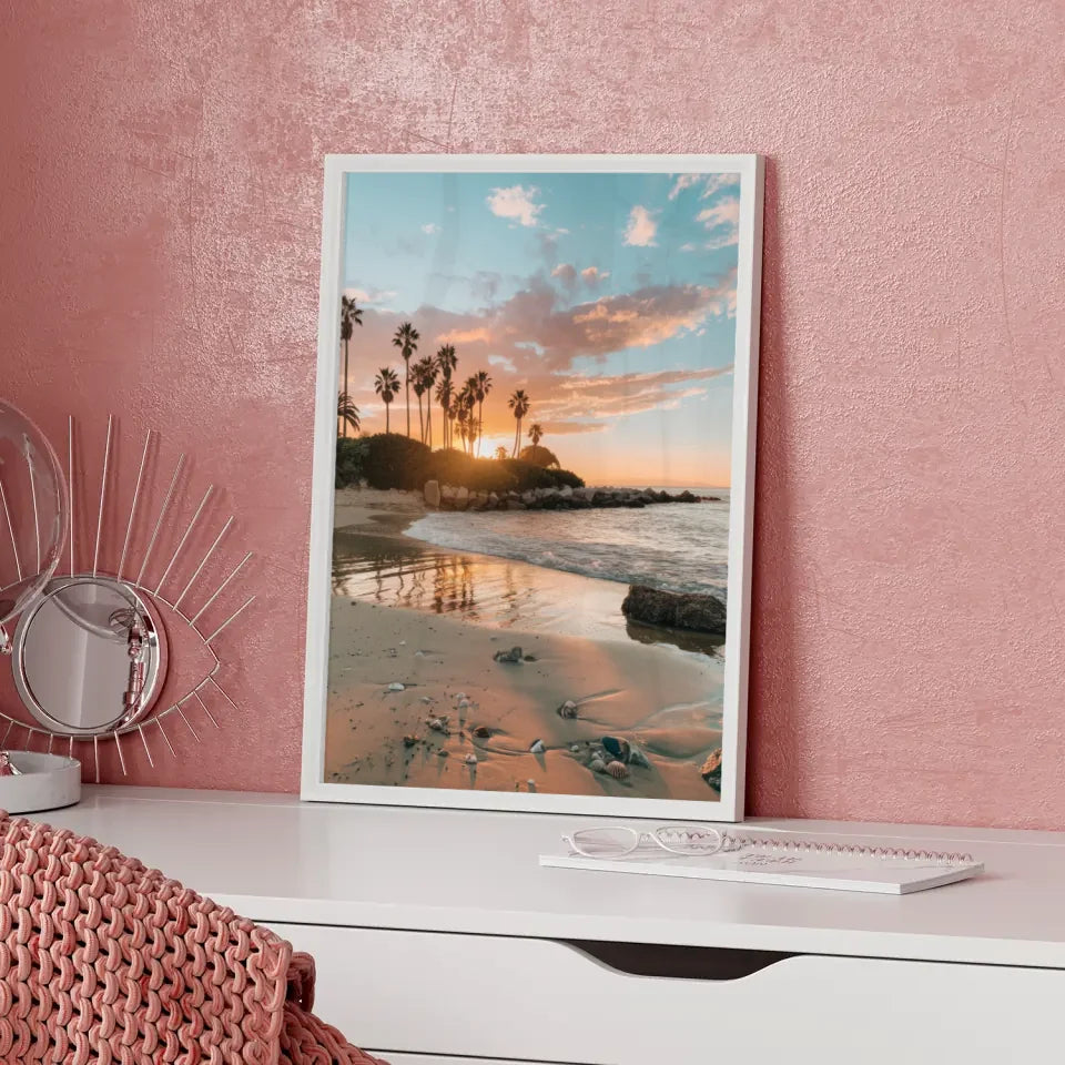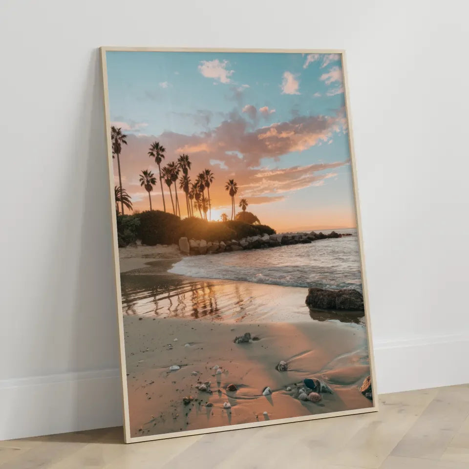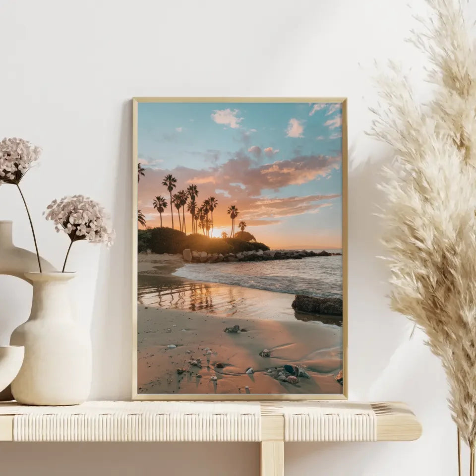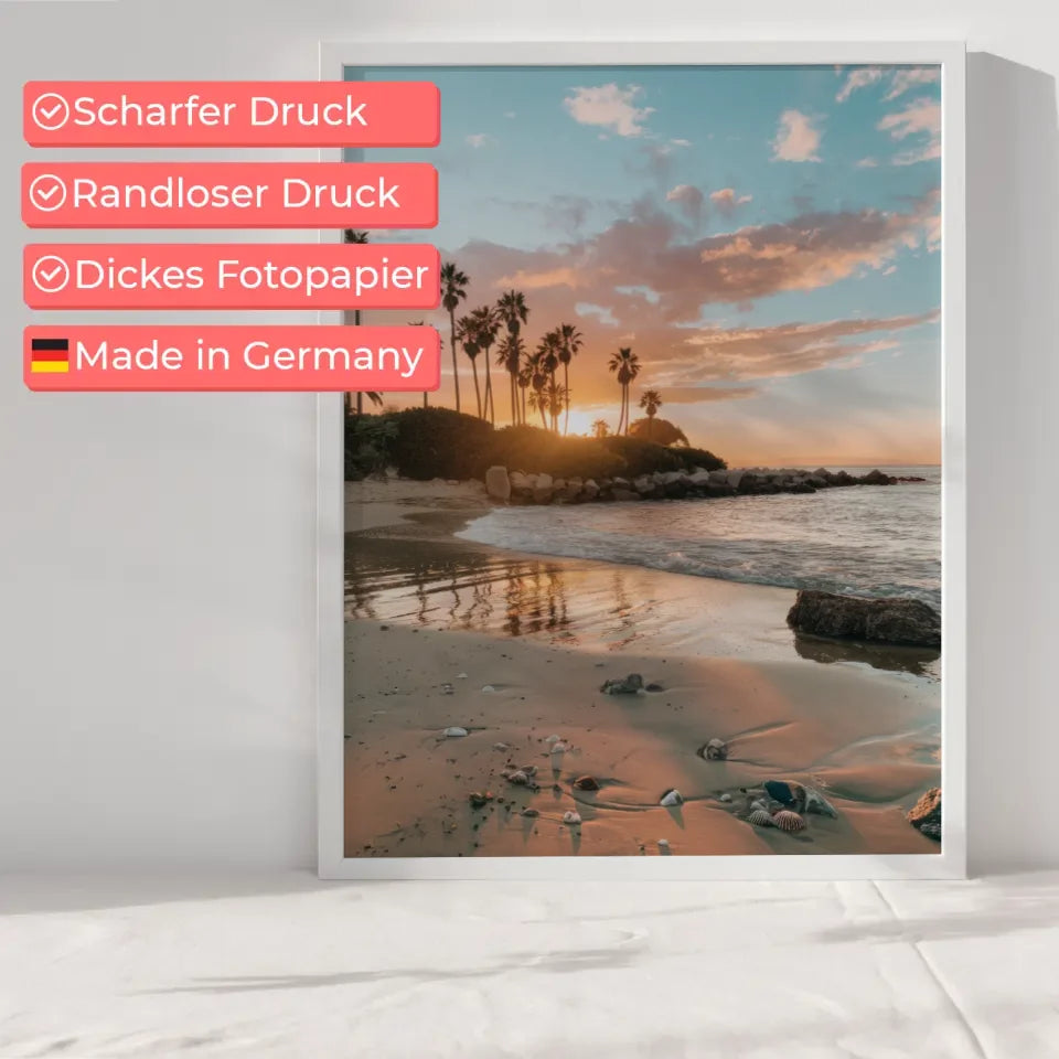 Mit dem Poster Sonnenuntergang am Strand in Kalifornien mit Palmen und Muscheln setzen Sie stilvolle Akzente in Ihrem Wohn- oder Schlafzimmer. Ideal für Strandliebhaber und alle, die sich nach den Wundersames der Küstenlandschaft sehnen. Lassen Sie Ihre Wände mit diesem faszinierenden Poster erstrahlen und genießen Sie die entspannende Wirkung der maritimen Szenerie.