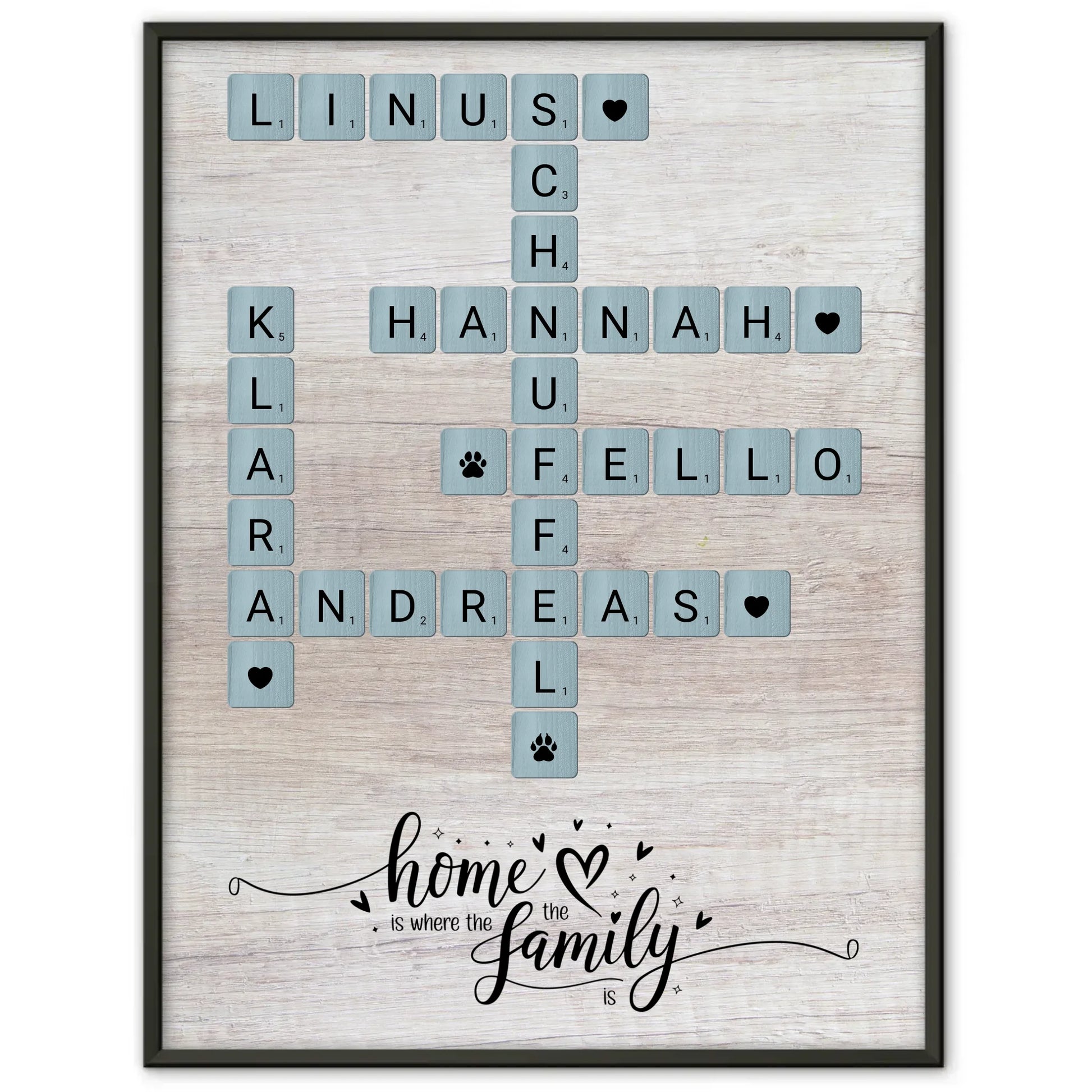 Möchtest du etwas Besonderes für deine Familie schaffen? Mit unserem Bilderrahmen im Scrabble Style mit Namen, ob inklusive Hund oder ohne, erzählst du deine ganz persönliche Familiengeschichte. Überrasche deine Lieben mit diesem einzigartigen Familiensymbol und kreiere unvergessliche Momente.