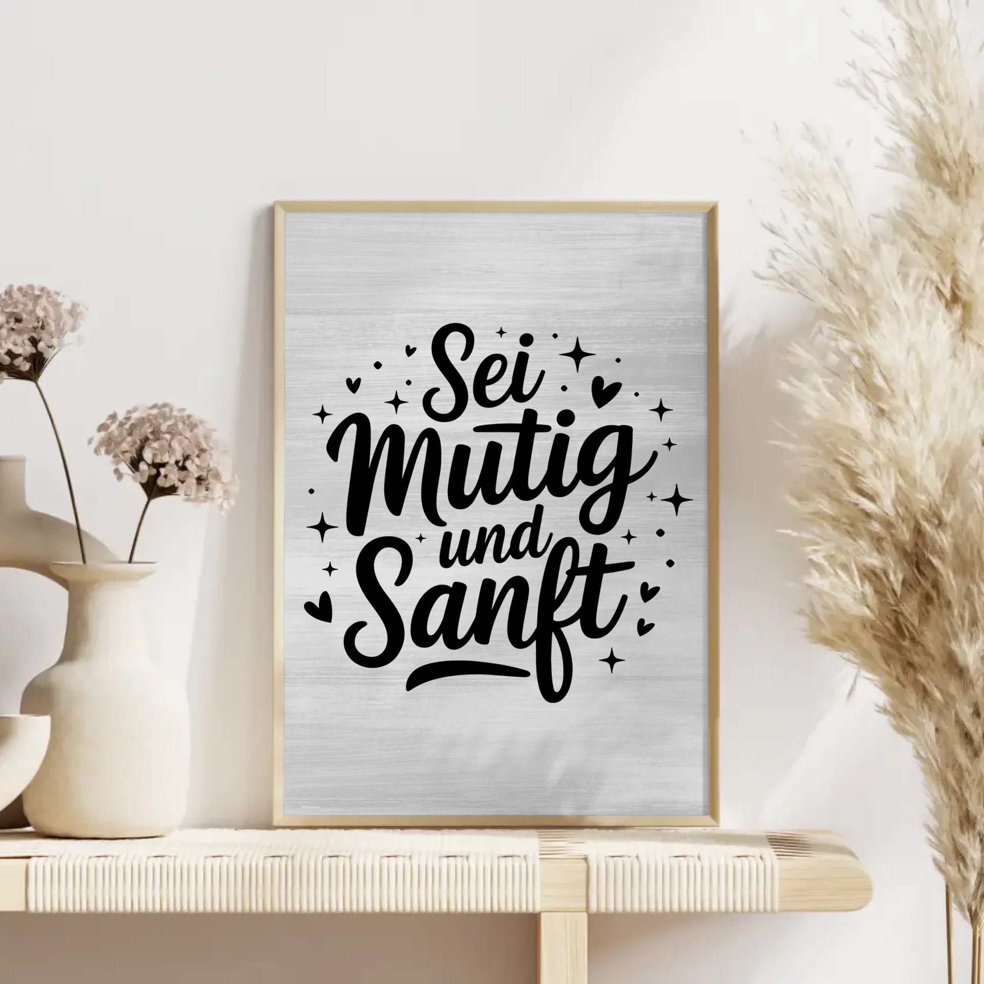 Lass deiner Kreativität freien Lauf und überrasche jemanden ganz besonders – denn jedes Geschenk soll etwas Einzigartiges sein. Bestelle jetzt dein persönliches Poster Spruch Sei mutig und sanft!
