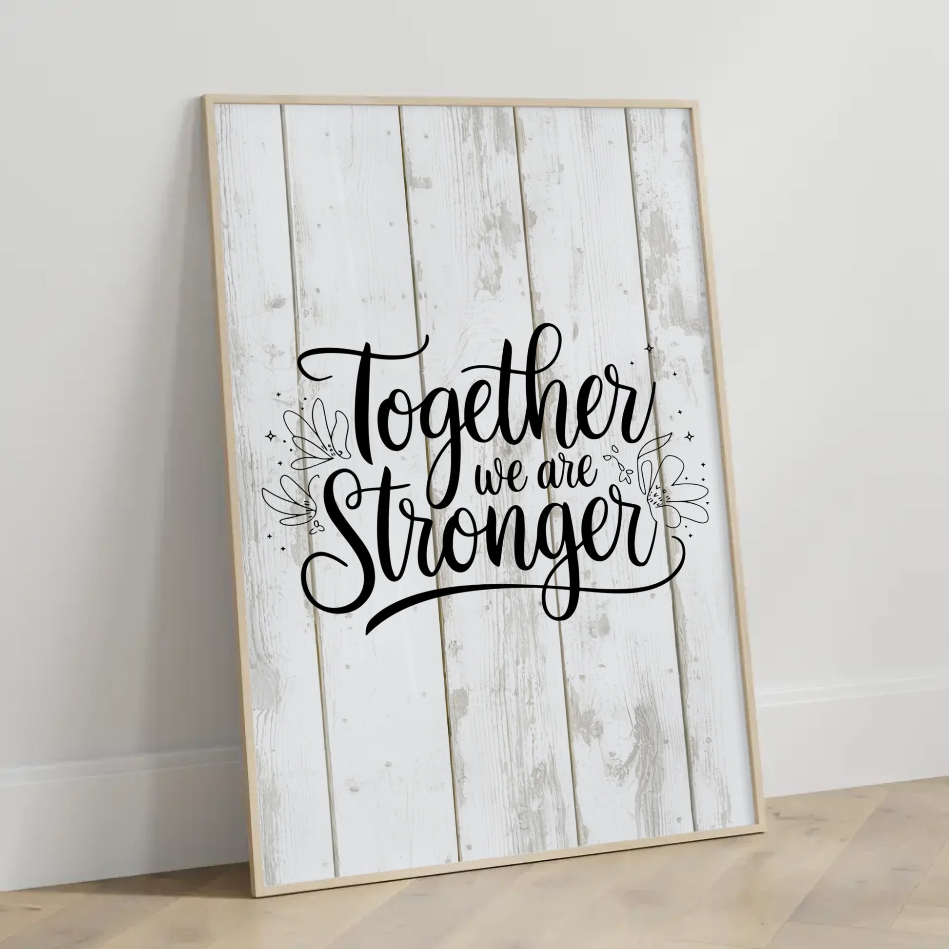 Suchst du nach einem besonderen Geschenk, das durch persönliche Note besticht? Unser Poster Spruch Together we are stronger personalisiert ist die perfekte Wahl! Du kannst das Hintergrundbild individuell gestalten und so ein ganz persönliches Kunstwerk schaffen, das ideal für jeden Anlass ist. Egal ob zum Geburtstag, zur Hochzeit oder einfach als liebevolle Geste – dieses Poster mit Spruch bringt deine Botschaft nicht nur zum Ausdruck, sondern verschönert auch jedes Zuhause.