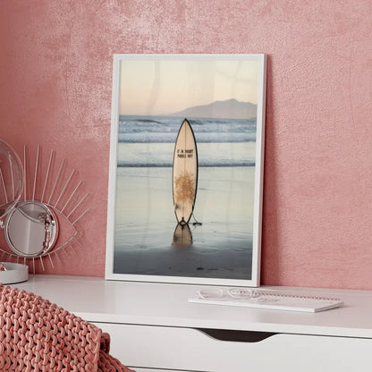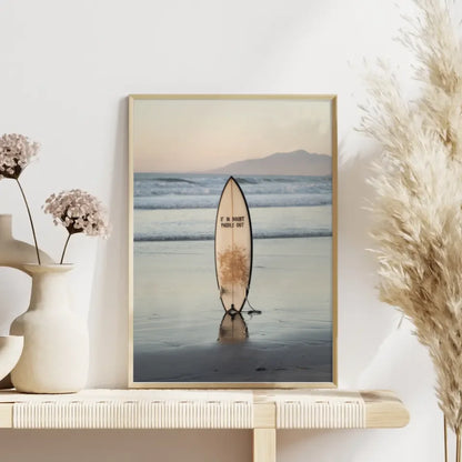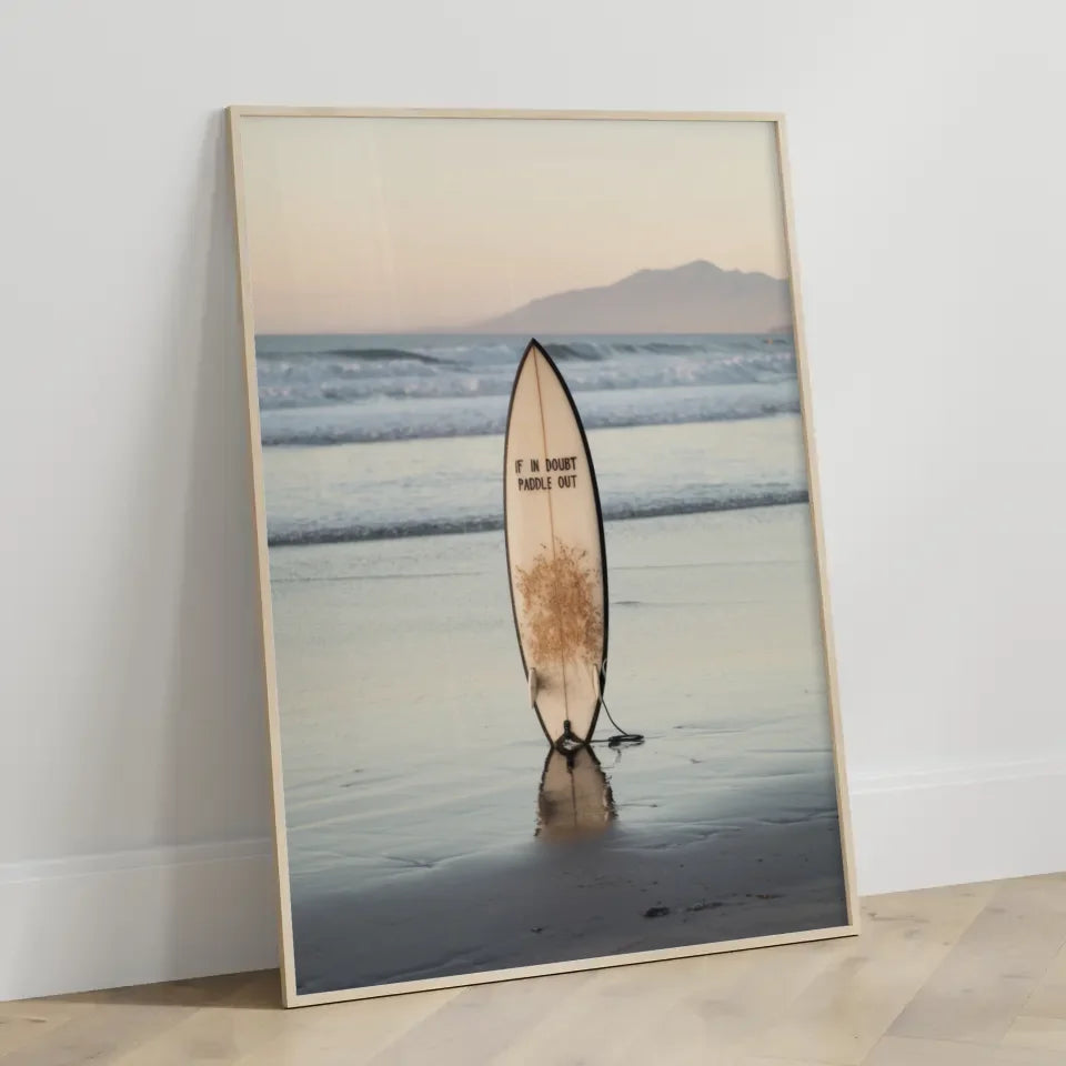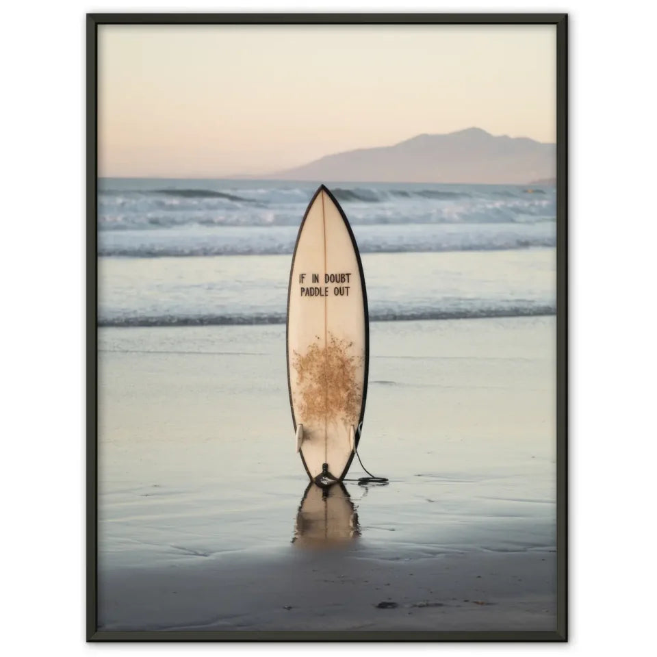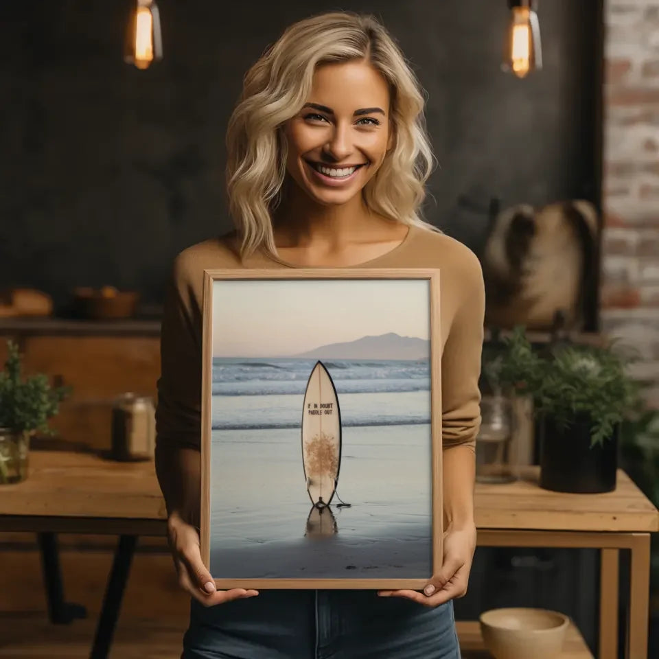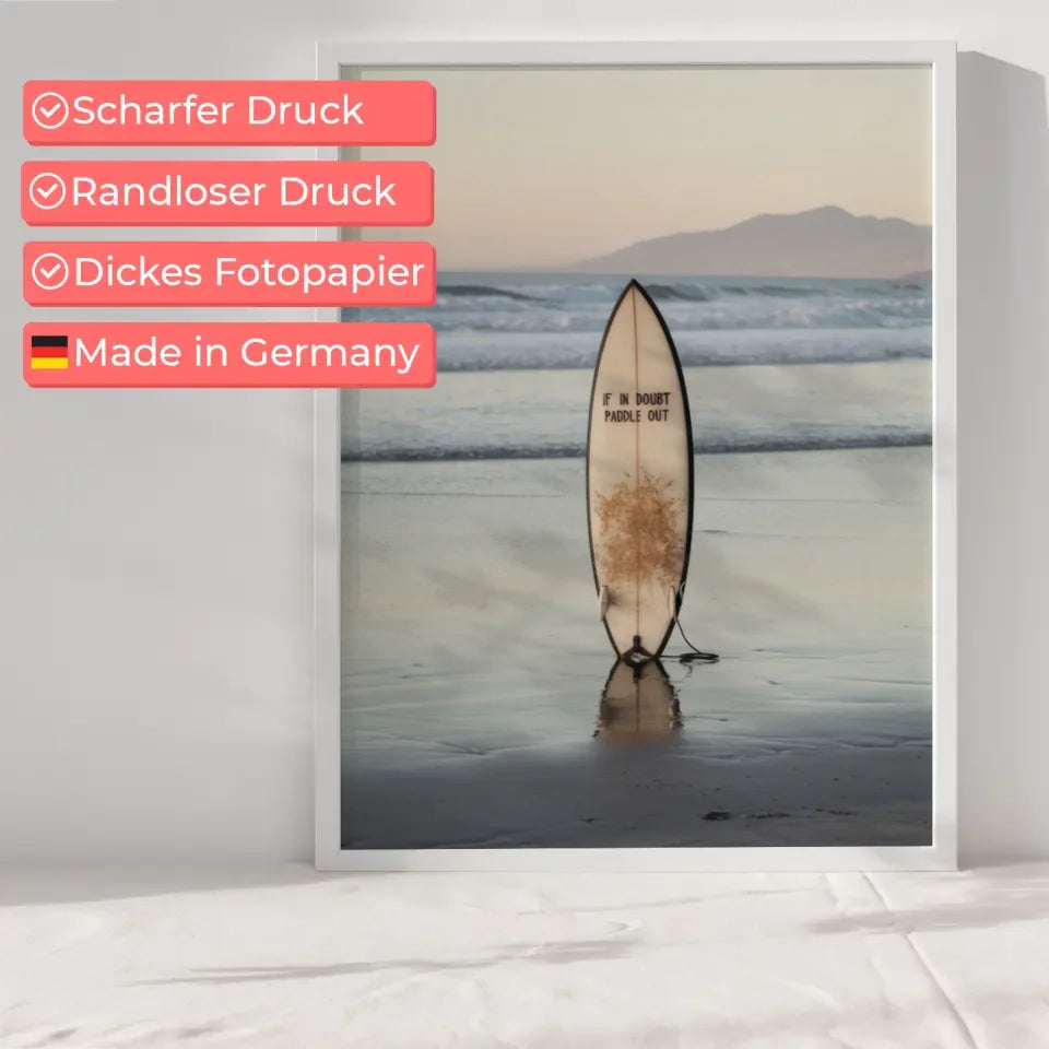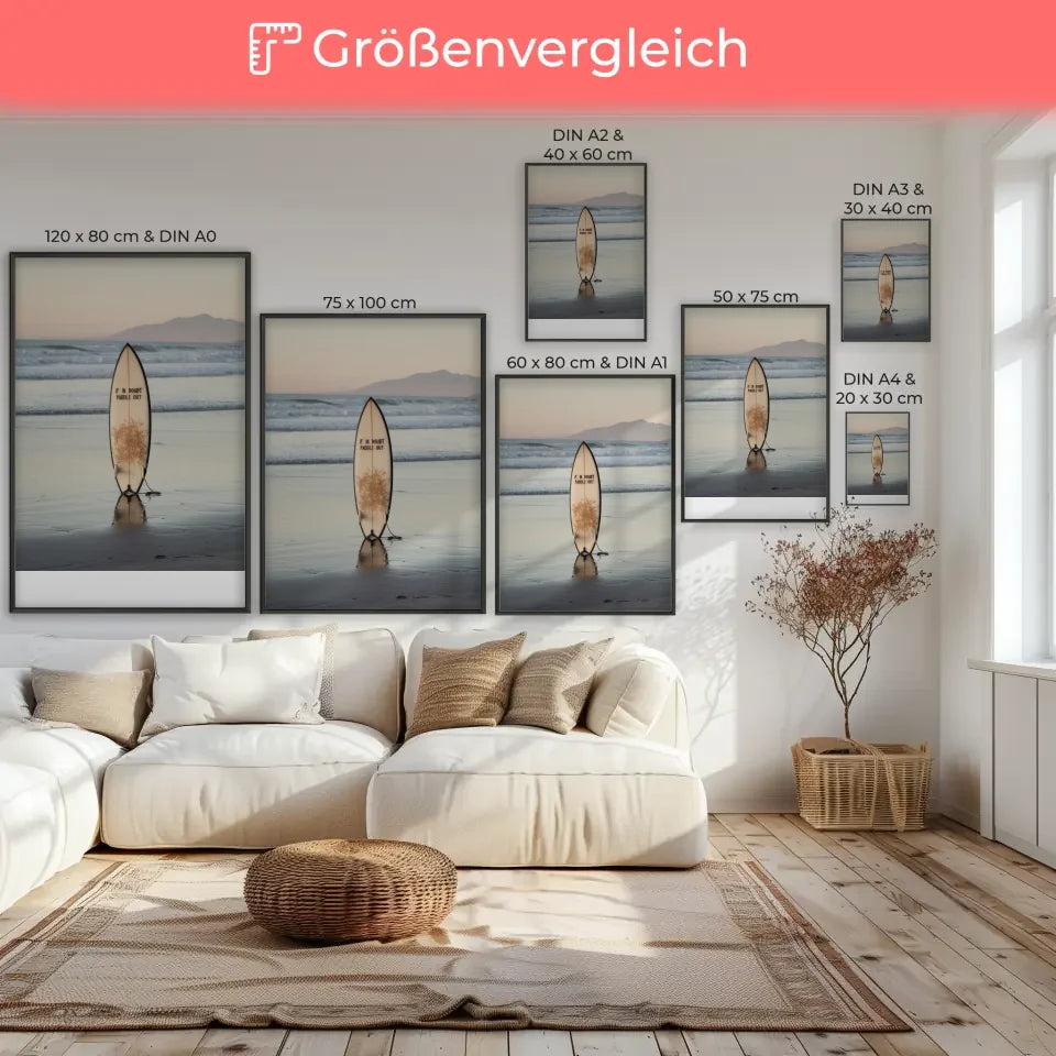Entdecken Sie unser atemberaubendes Poster Strandkulisse mit Surfbrett und beruhigender Abenddämmerung, das das perfekte Ambiente für Ihre Wände schafft. Dieses beeindruckende Poster zeigt eine ruhige Strandlandschaft, die in sanften Farben während der Abenddämmerung erstrahlt. Der Fokus liegt auf einem stilvollen Surfbrett, das aufrecht im nassen Sand steht und dessen Spiegelbild schwach im seichten Wasser zu sehen ist. Die harmonische Inszenierung wird durch die Aufschrift 'Im Zweifelsfall paddeln Sie raus“ auf dem Surfbrett ergänzt, die ein Gefühl von Abenteuer und Entspannung vermittelt. Sanfte Wellen schlagen sanft ans Ufer und kreieren eine friedliche Atmosphäre, während die Silhouette von Bergen im Hintergrund für einen malerischen Anblick sorgt. Dieses Poster eignet sich hervorragend, um jeden Raum mit einer wohnlichen und gleichzeitig dynamischen Note zu bereichern. Ideal für Surf- und Strandliebhaber, verwandelt dieses Poster Ihre Wände in eine Oase des Wohlbefindens. Holen Sie sich das Poster Strandkulisse mit Surfbrett und beruhigender Abenddämmerung noch heute und genießen Sie jeden Tag den Anblick dieser traumhaften Szene!