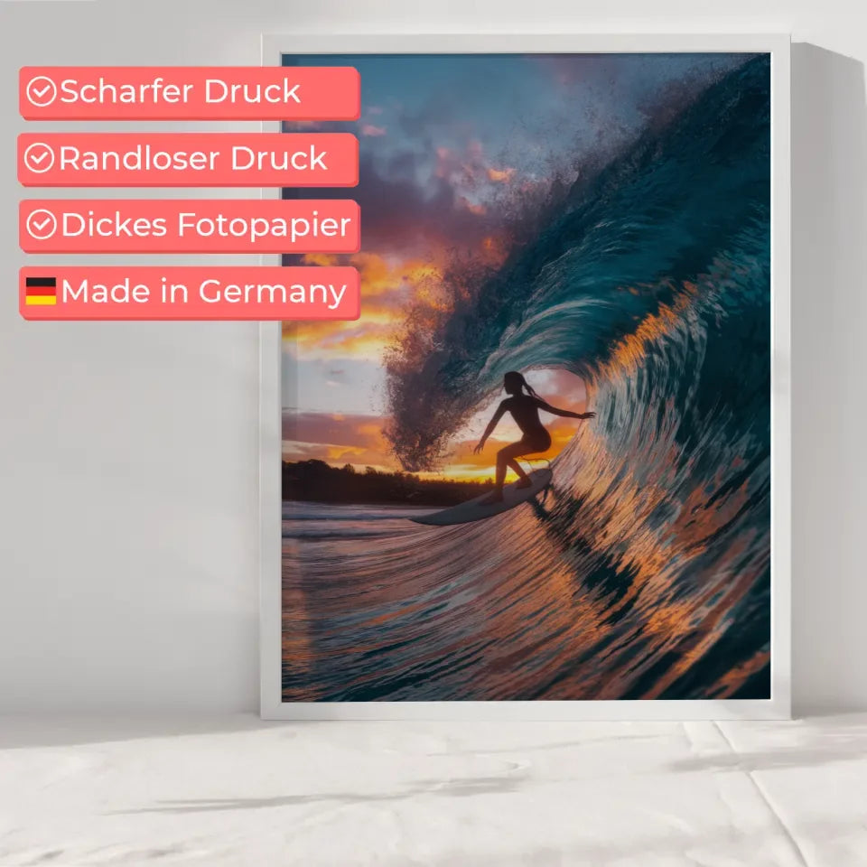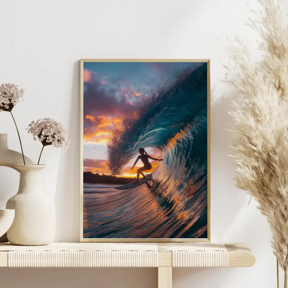 Entdecke das beeindruckende Poster Surferin Welle Sonnenuntergang, ein farbenfrohes Kunstwerk, das jedem Raum in deinem Zuhause einen Hauch von Abenteuer und Stil verleiht. Dieses atemberaubende Poster zeigt eine anmutige Surferin, die mit Leichtigkeit auf einer riesigen Welle reitet, während der Sonnenuntergang in tiefen Orange-, Purpur- und Blautönen erstrahlt. Die harmonische Kombination aus lebendigen Farben und der beeindruckenden Silhouette der Surferin macht dieses Kunstwerk zu einem echten Blickfang. Die Welle selbst pulsiert vor Energie und Kreativität, was sie zu einem perfekten Highlight für dein Zuhause macht. Wenn du nach einem Poster suchst, das sowohl Ruhe als auch Dynamik ausstrahlt, bist du hier genau richtig. Ob im Wohnzimmer, im Schlafzimmer oder im Büro – dieses Poster schafft eine inspirierende Atmosphäre und bringt das Element des Surfens direkt zu dir nach Hause. Verleihe deinen Wänden mit diesem einzigartigen Poster eine neue Dimension und teile deine Leidenschaft für das Surfen mit jedem, der vorbeikommt.