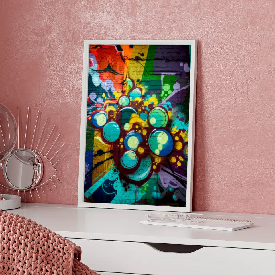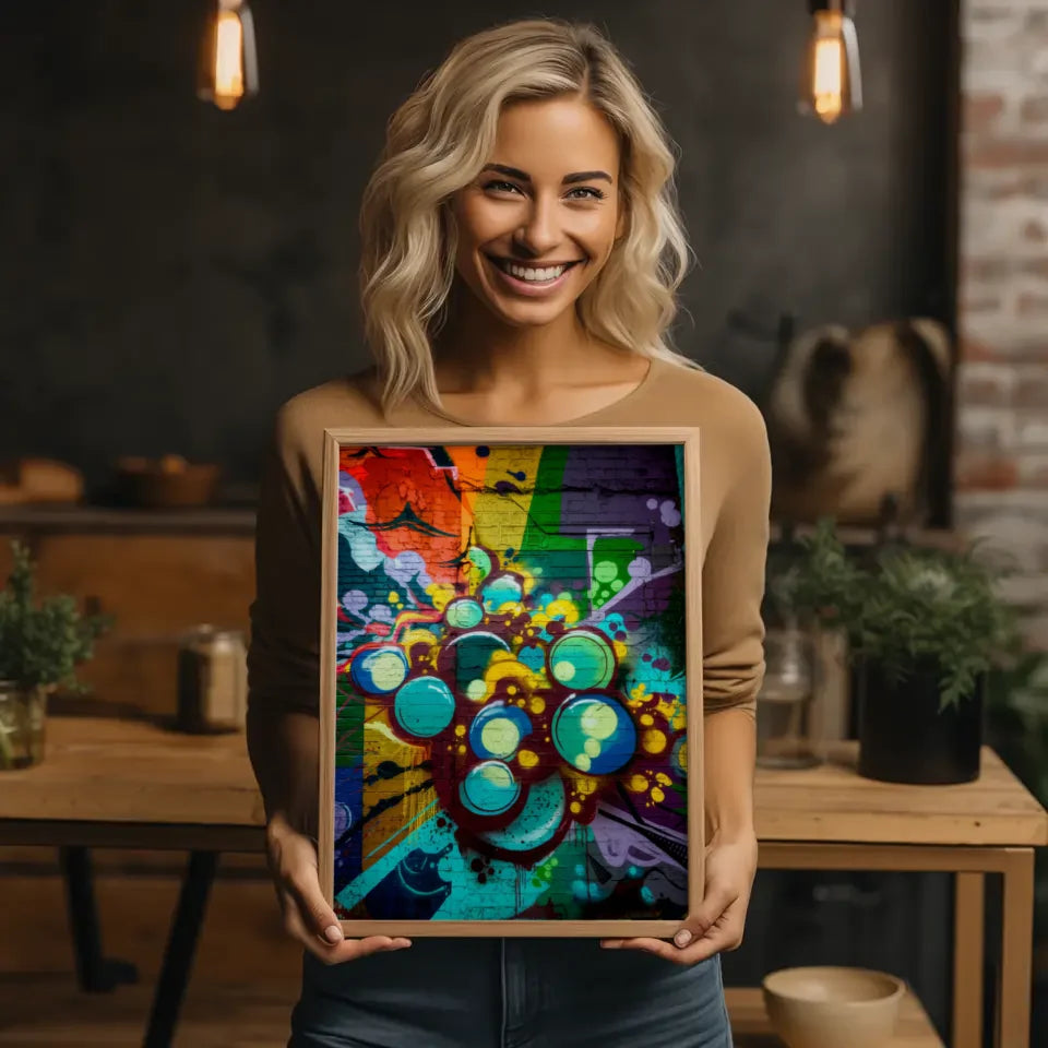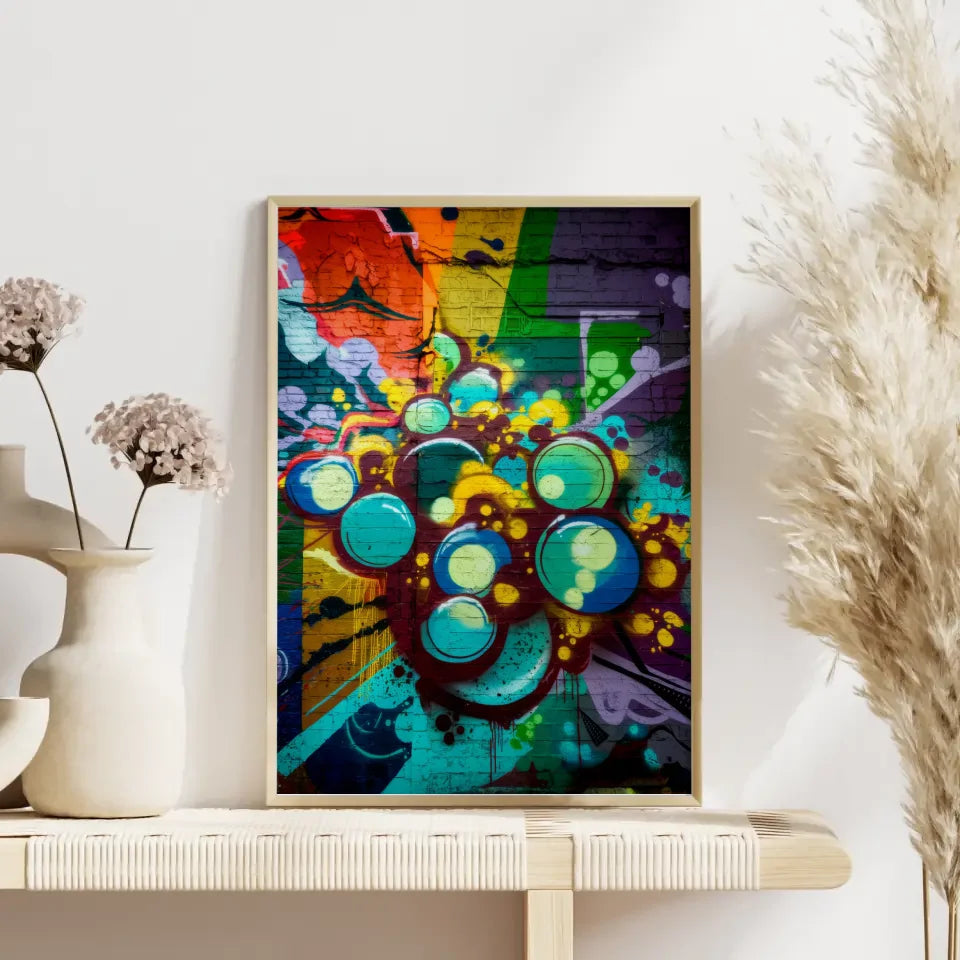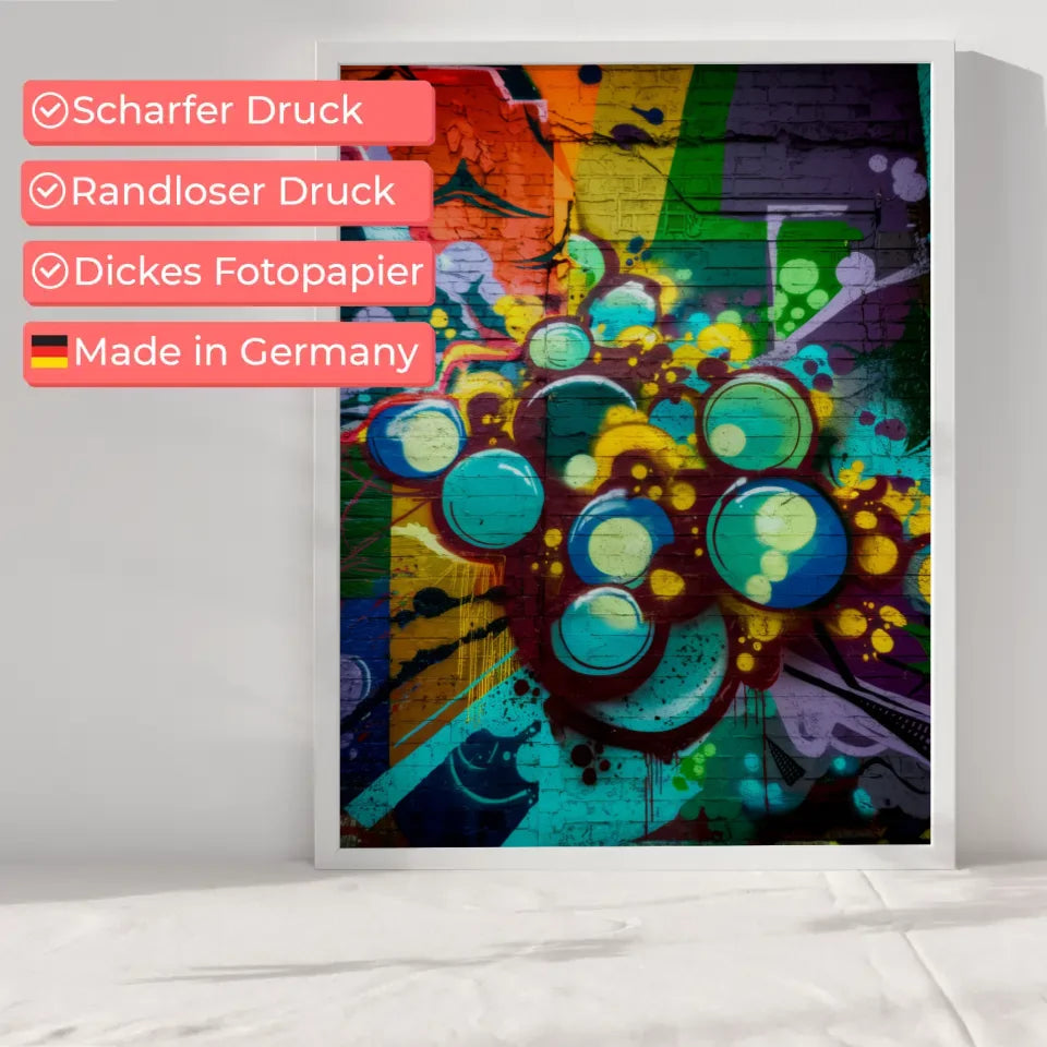 Bringen Sie style und Ausstrahlung in Ihre Wohnräume mit unserem stilvollen Poster. Ob im Wohn- oder Arbeitszimmer, dieses Stück Kunst entsteht zum Blickfang und inspiriert jeden Betrachter. Bestellen Sie noch heute Ihr Poster urbanes Graffiti lebendige Farben auf Ziegelwand und verwandeln Sie Ihre Wände in eine Galerie urbaner Kunst!