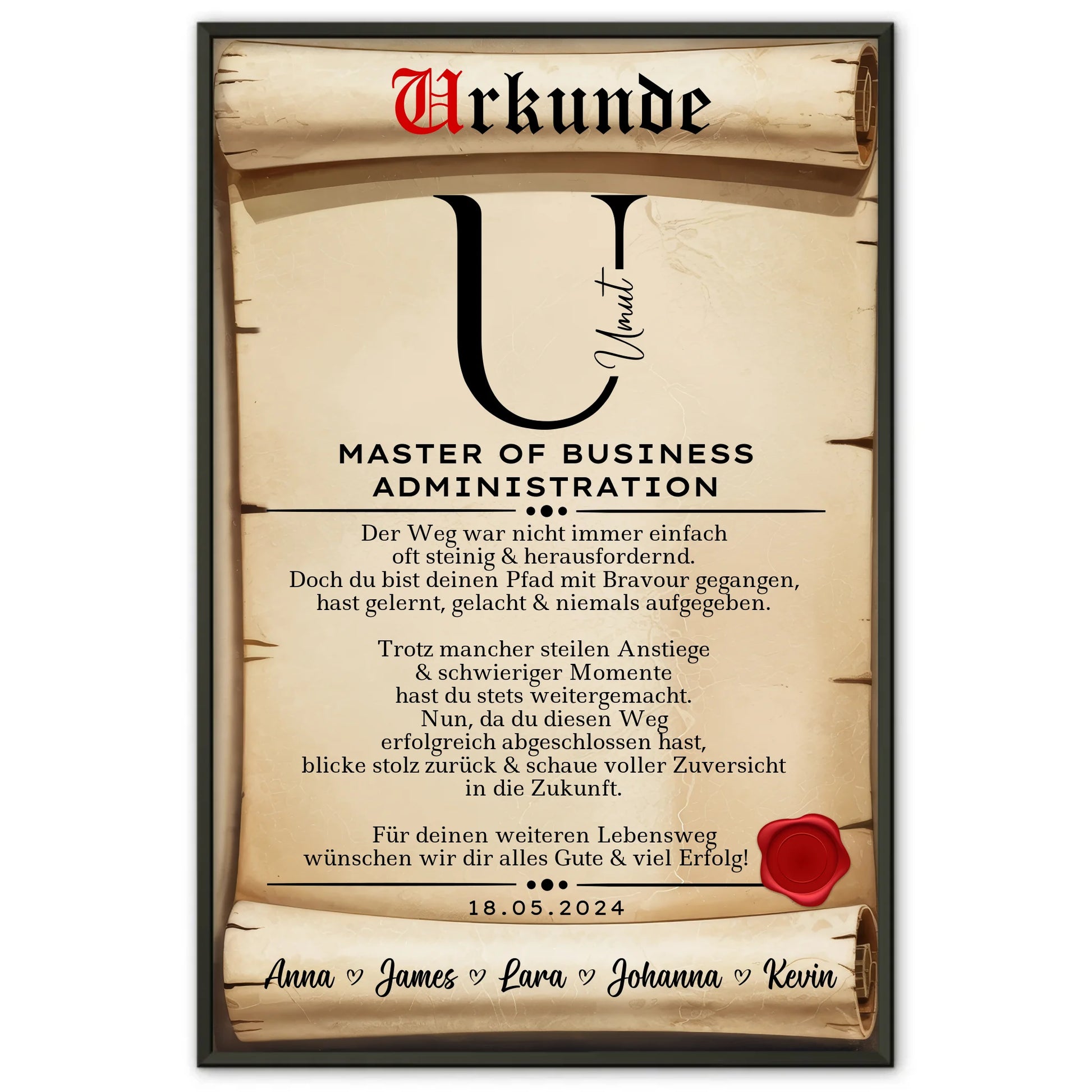 Unser Poster Urkunde Geschenk Masterabschluss Master Of Business Administration ist nicht nur ein tolles Geschenk zum Master, sondern auch ein hochwertiges Erinnerungsstück, das in jedem Zuhause oder Büro einen Ehrenplatz verdient hat. Überrasche deinen Freund, deine Freundin oder Kollegen mit diesem individuellen Meisterwerk und mache den Moment des Erfolgs unvergesslich!