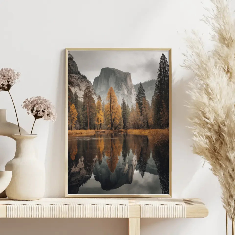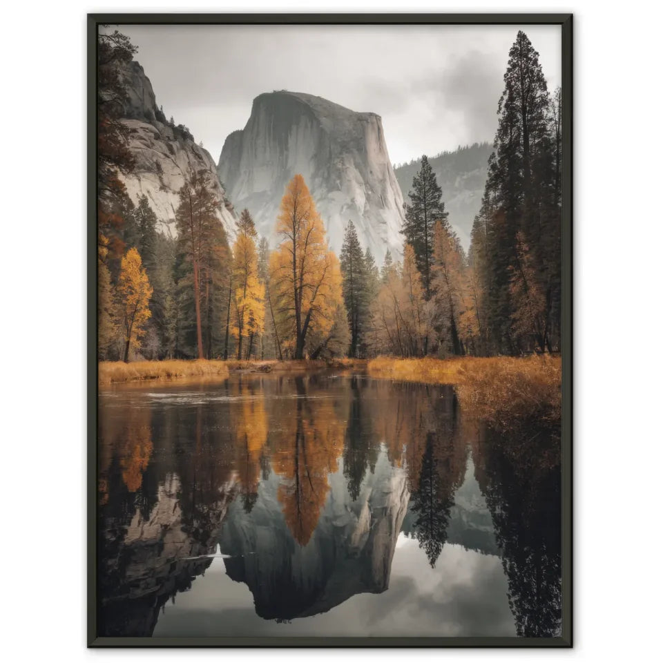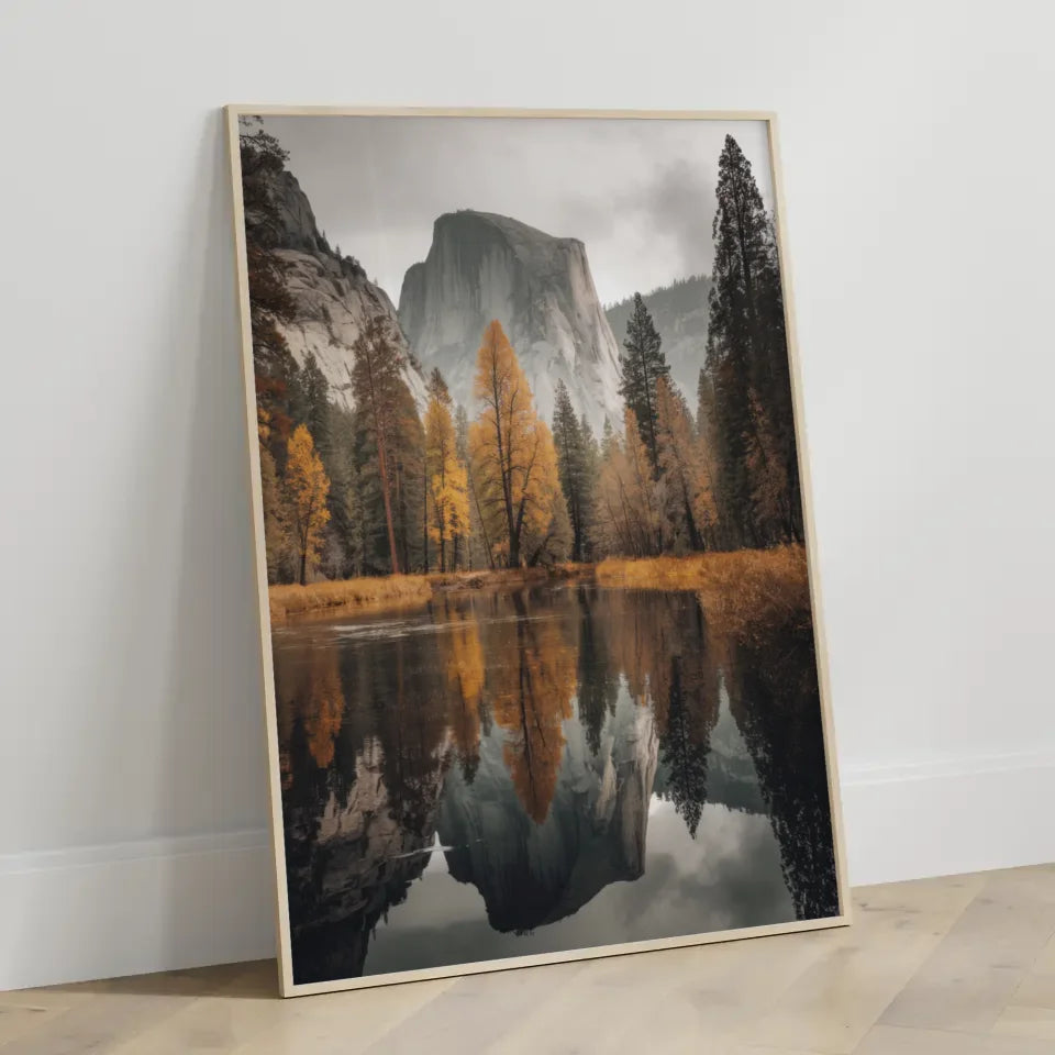 Verleihen Sie Ihrem Zuhause mit unserem atemberaubenden Poster von ruhiger Landschaft mit Granitfelsen und herbstlichen Bäumen einen Hauch von Natur. Dieses kunstvolle Wandbild zeigt eine beeindruckende Szene, in der hoch aufragende Granitfelsen majestätisch aus einem friedlichen Waldgebiet herausragen. Die Bäume, die in warmen Gold- und Bernsteintönen erstrahlen, säumen den ruhigen Fluss und schaffen ein harmonisches Gesamtbild. Das Poster fängt die melancholische Stimmung des bewölkten Himmels ein und lässt den Betrachter in eine Welt voller Ruhe und natürlicher Schönheit eintauchen.