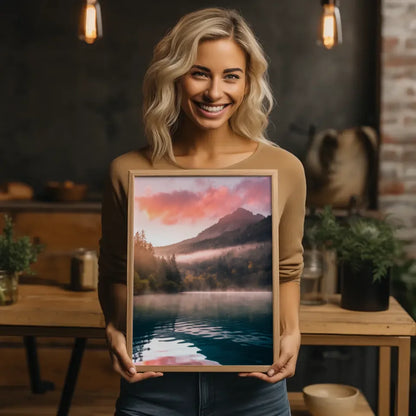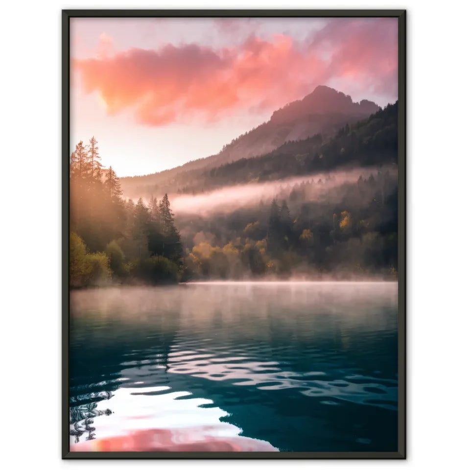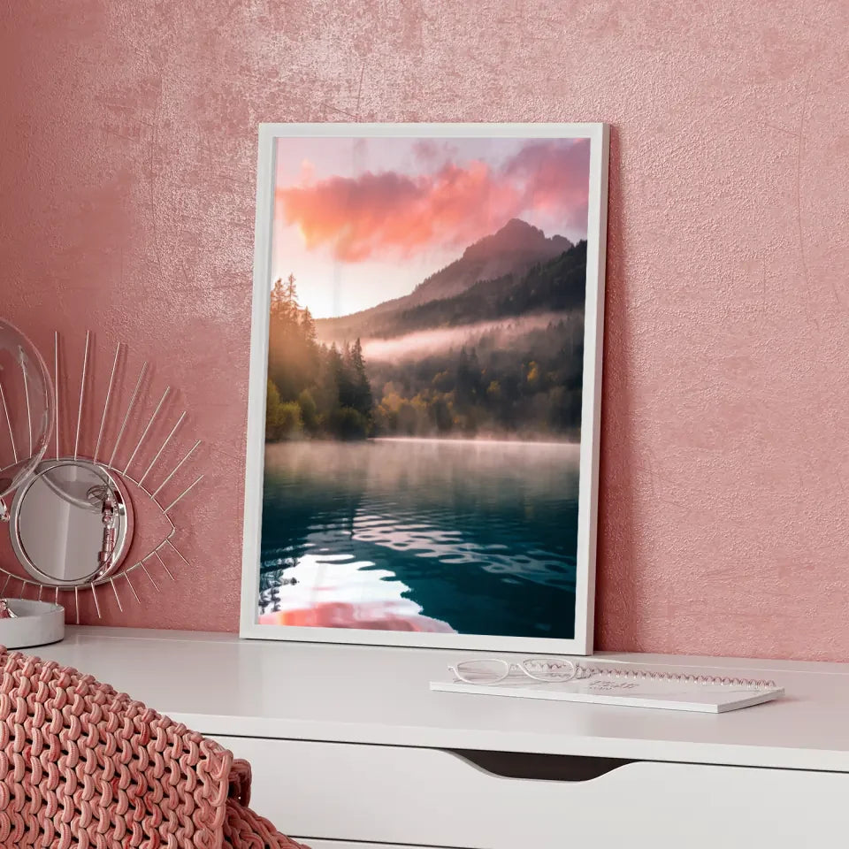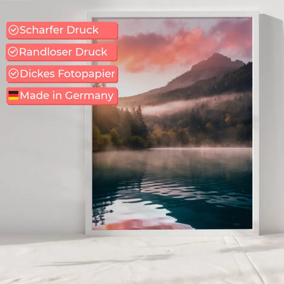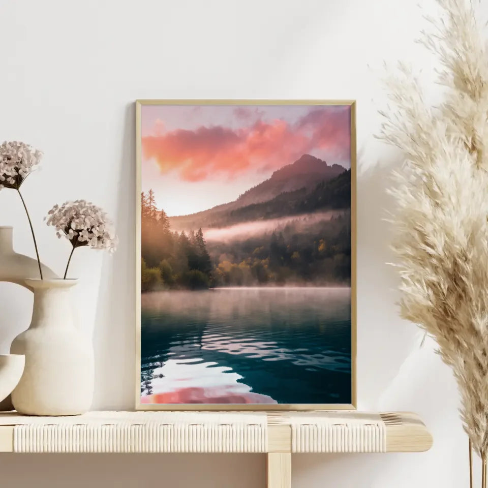 Verleihen Sie Ihrem Wohnraum mit unserem beeindruckenden Poster von ruhiger Naturlandschaft mit Sonnenaufgang über dem See eine harmonische Note. Dieses atemberaubende Kunstwerk präsentiert einen nebligen Sonnenaufgang, der den Himmel in sanfte Rosa- und Orangetöne taucht. Die malerische Szenerie zeigt einen waldbedeckten Berg sowie majestätische Bäume, die sich sanft im glitzernden Wasser des Sees spiegeln. Jedes Detail dieses Posters wurde sorgfältig ausgewählt, um die friedliche Atmosphäre der Natur einzufangen.