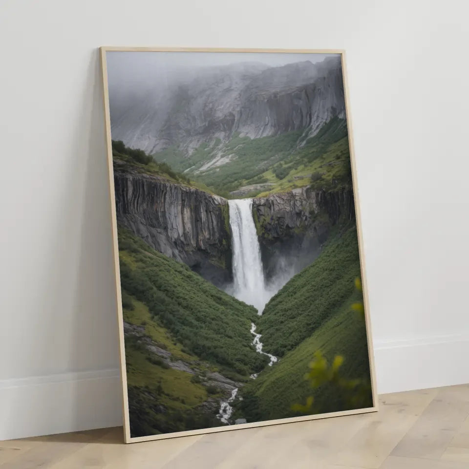 Entdecken Sie unser beeindruckendes Poster Vøringsfossen Wasserfall Norwegen Naturmotiv im grünen Tal. Dieses atemberaubende Kunstwerk bringt die Schönheit der Natur direkt in Ihr Zuhause. Das Poster zeigt den majestätischen Vøringsfossen, einen der bedeutendsten Wasserfälle Norwegens, der mit seiner beeindruckenden Höhe von 182 Metern über ein üppiges, grünes Tal stürzt.