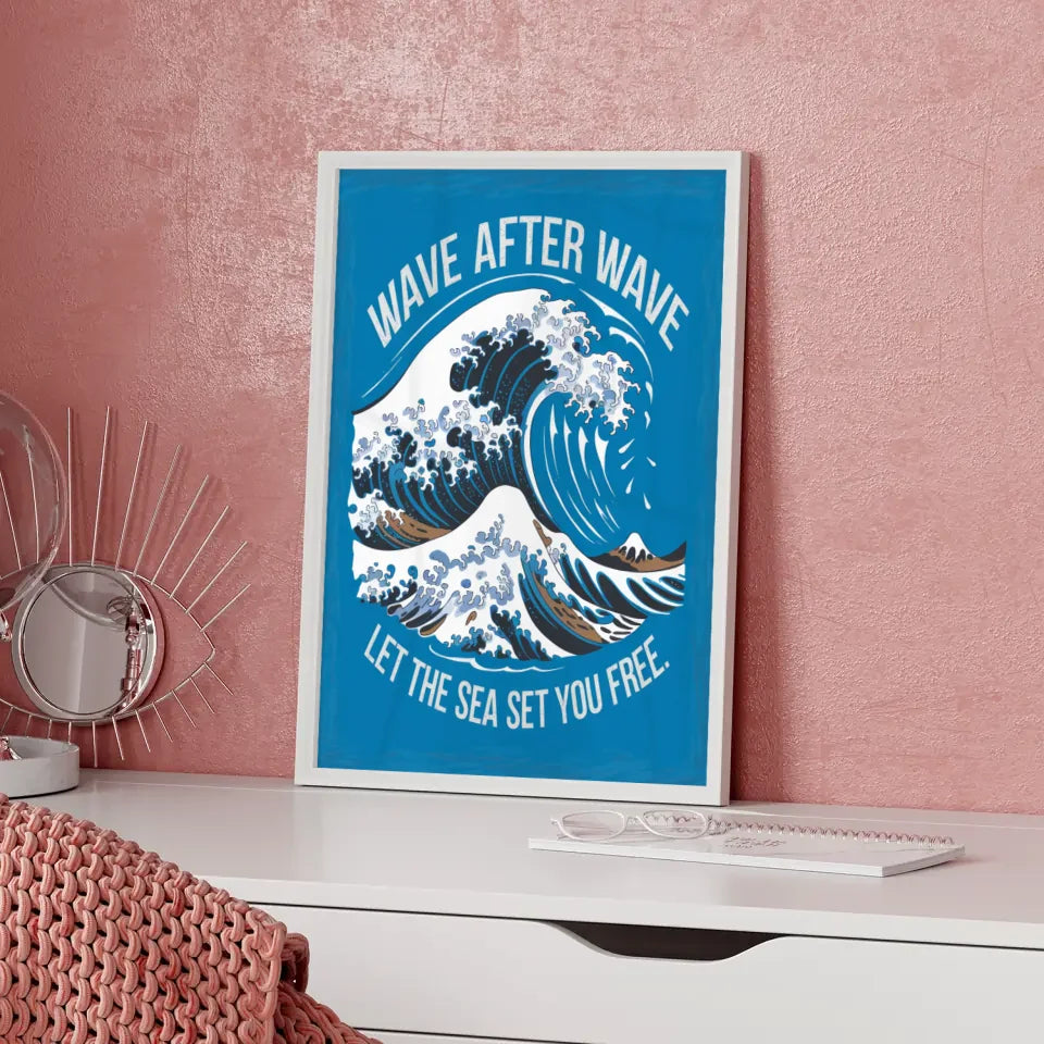 Entdecken Sie unser einzigartiges Poster Welle, das mit einer lebendigen Illustration einer beeindruckenden weißen Welle begeistert. Dieses Wandbild bringt Dynamik und Energie in jeden Raum. Die Welle stürzt majestätisch vor einem leuchtend blauen Hintergrund nach unten und zieht dadurch die Blicke Ihrer Gäste sofort auf sich. Mit dem inspirierenden Spruch 'let the sea set you free“ unterhalb der Welle vermittelt dieses Poster eine Botschaft von Freiheit und Abenteuern.
