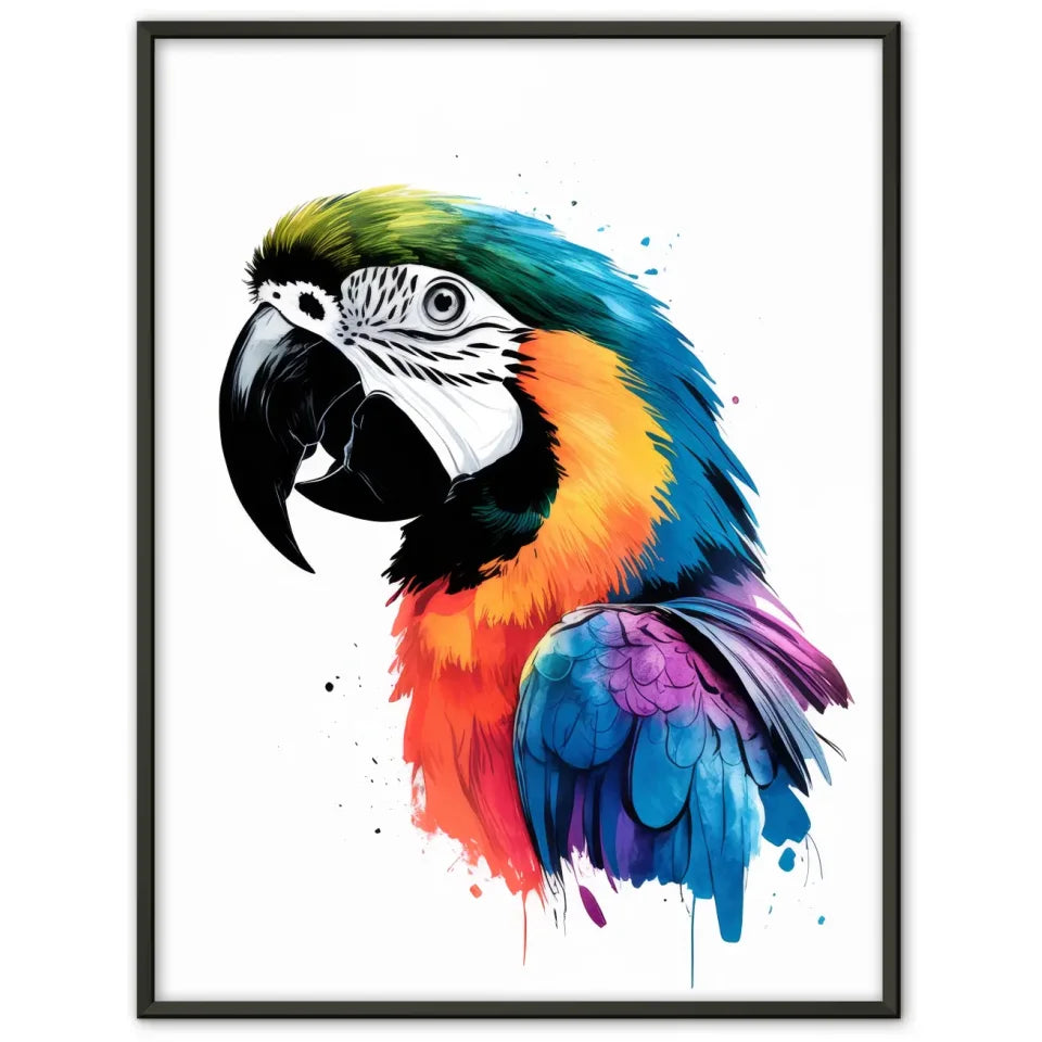 Der Fokus des Posters liegt auf dem detailreichen Gesicht des Papageis, das mit unglaublicher Präzision und Tiefe wiedergegeben ist. Der durchgehend weiße Hintergrund sorgt dafür, dass die lebhaften Farben des Papageis perfekt zur Geltung kommen. Dieses Poster vereint die Essenz der Porträtfotografie und der Illustration und schafft so ein harmonisches Zusammenspiel von Kunst und Design.