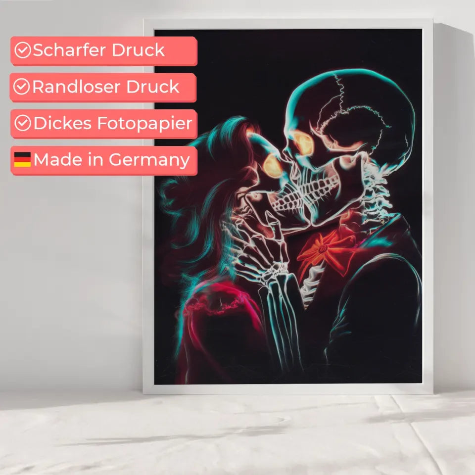 Entdecken Sie unser einzigartiges Wandbild, das Ihre Wände mit seinem fesselnden Design zum Leben erweckt. Der romantische Neon Schädel Poster ist ein digitales Kunstwerk, das die Leidenschaft und Intensität eines Paares in einem leidenschaftlichen Kuss einfängt. Die leuchtenden Farben des Schädels heben dieses Kunstwerk hervor und verleihen Ihrem Raum eine unverwechselbare Atmosphäre.