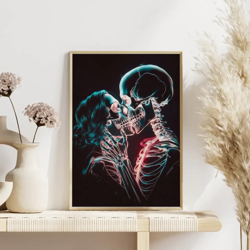 Entdecken Sie unser einzigartiges Wandbild, das Ihre WÀnde mit seinem fesselnden Design zum Leben erweckt. Der romantische Neon SchÀdel Poster ist ein digitales Kunstwerk, das die Leidenschaft und IntensitÀt eines Paares in einem leidenschaftlichen Kuss einfÀngt. Die leuchtenden Farben des SchÀdels heben dieses Kunstwerk hervor und verleihen Ihrem Raum eine unverwechselbare AtmosphÀre.