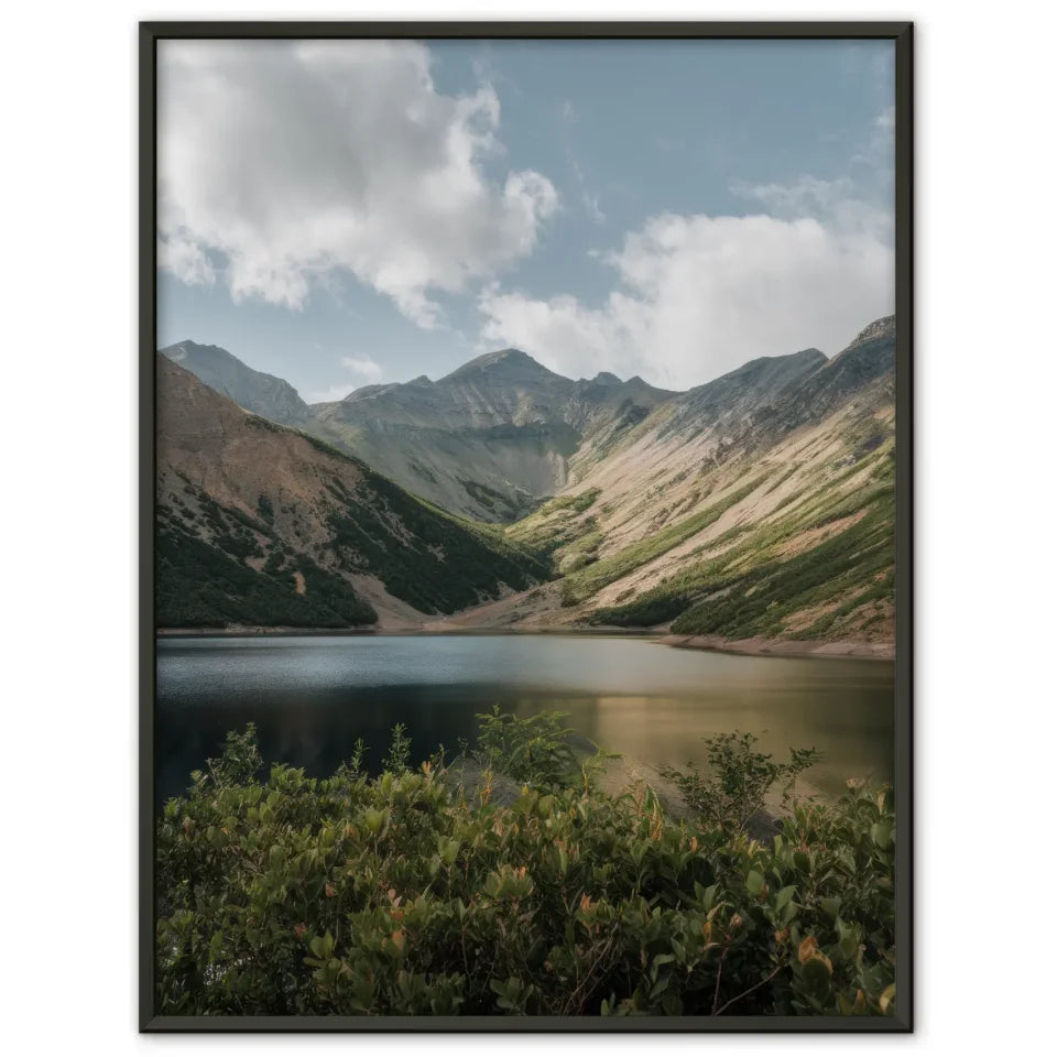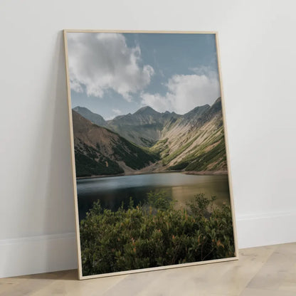Im Vordergrund des Posters sehen Sie üppiges grünes Gebüsch, das den Betrachter in die unberührte Natur hineinzuziehen scheint. Der See spiegelt die beeindruckende Umgebung wider und erzeugt einen faszinierenden spiegelähnlichen Effekt, der zum Verweilen einlädt. Die unterschiedlich gefärbten Berge in verschiedenen Grün- und Brauntönen deuten auf eine vielfältige Vegetation und interessante Felsformationen hin, die Ihrem Raum eine erfrischende Note verleihen.