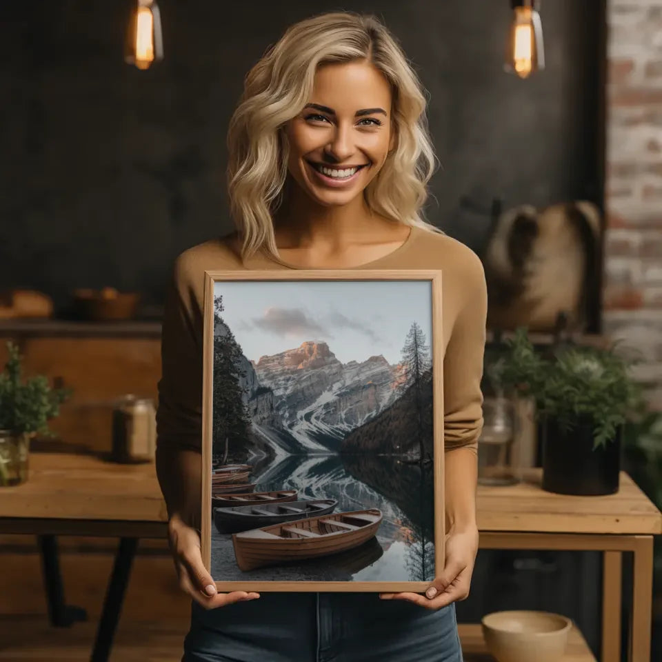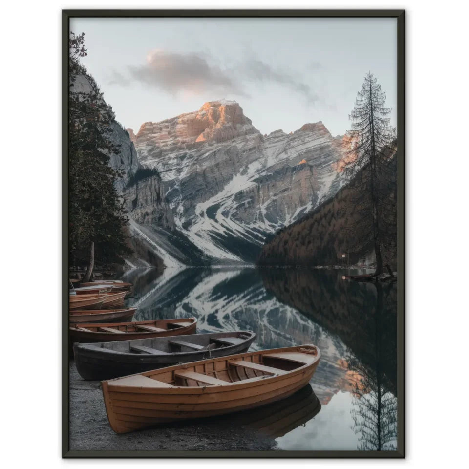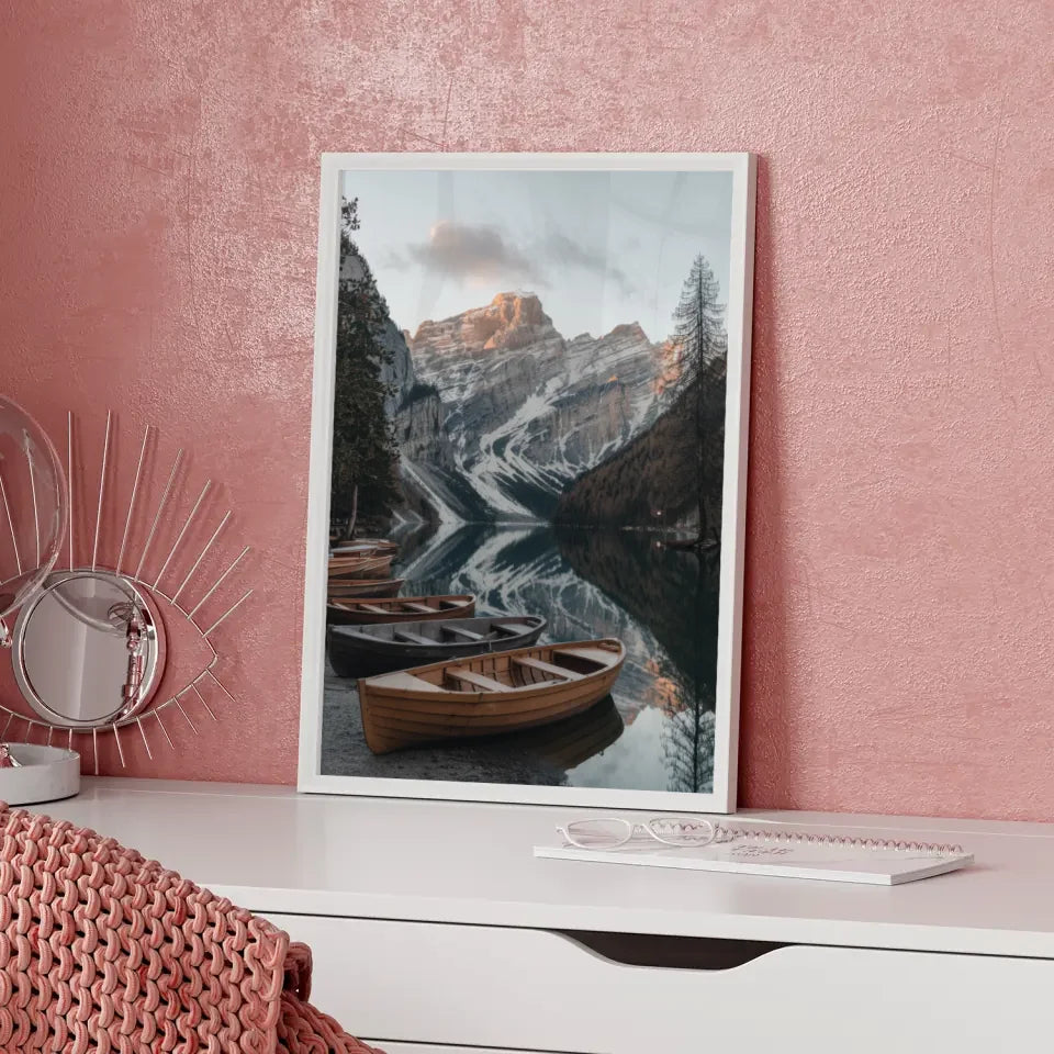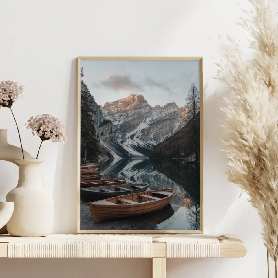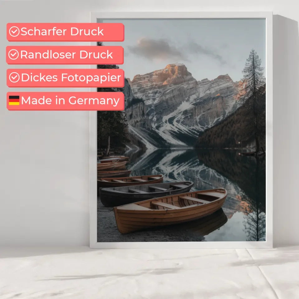 Entdecken Sie unser exklusives Ruhige Landschaft Poster mit See und schneebedeckten Bergen, das Ihre Wände in eine Oase der Ruhe verwandelt. Dieses atemberaubende Poster zeigt eine friedliche Szenerie, in der sich ein stiller See harmonisch mit schneebedeckten Bergen und einem strahlend blauen Himmel verbindet. Die Holzboote am Ufer verleihen demBild einen malerischen Charme, der perfekt für jede Art von Raum geeignet ist.