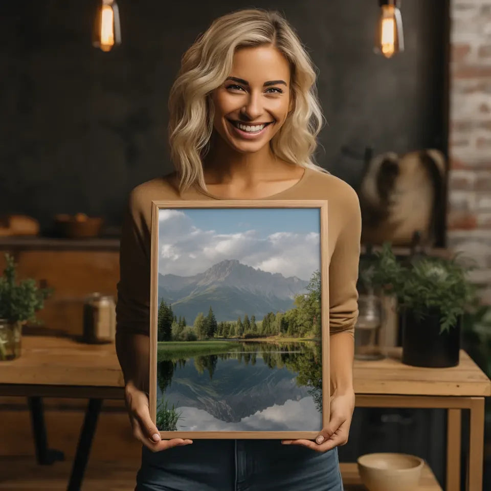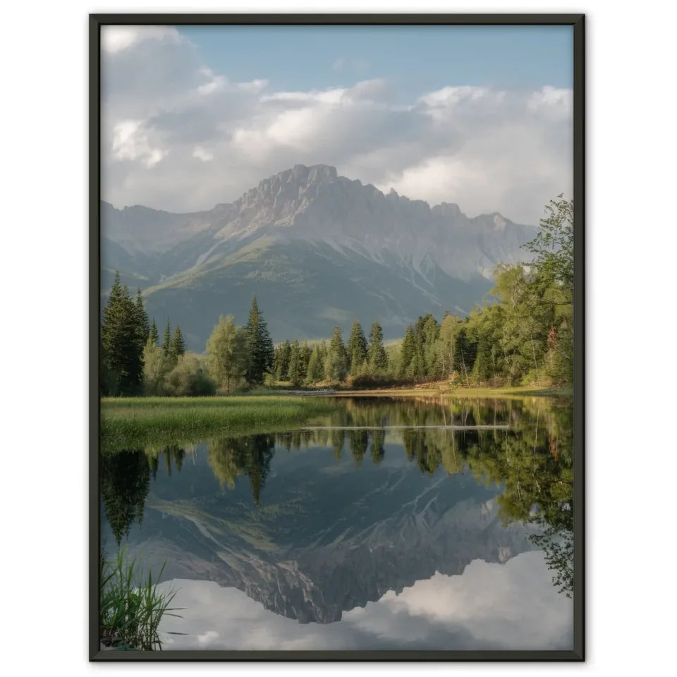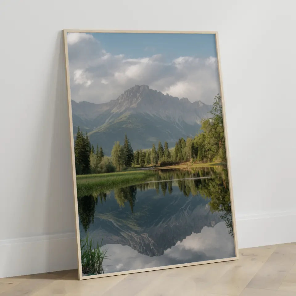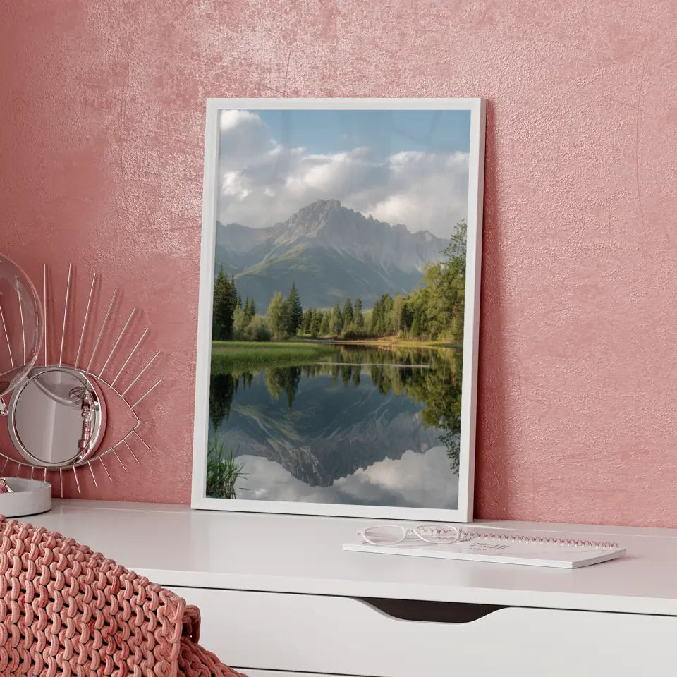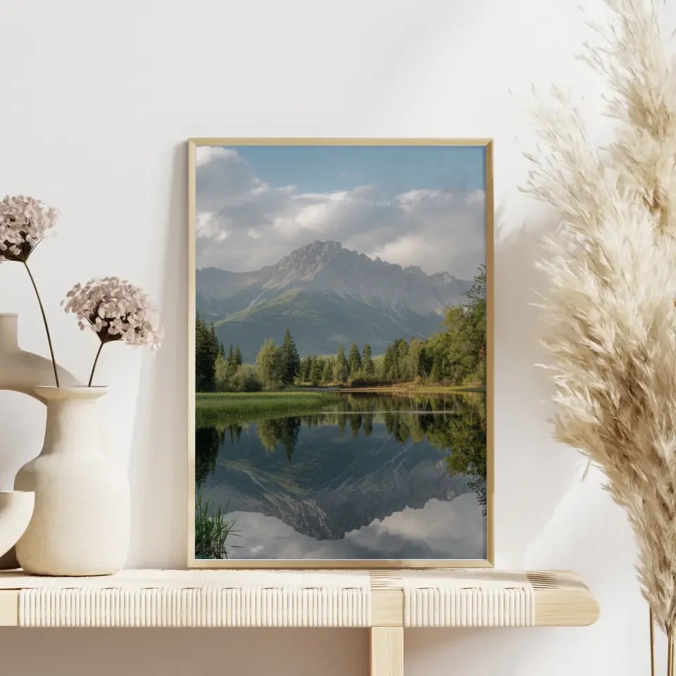 Entdecken Sie das atemberaubende Ruhige Landschaft Poster mit unberührtem See und Bergen, das Ihnen die Schönheit der Natur direkt in Ihr Zuhause bringt. Dieses beeindruckende Poster zeigt ein friedliches Landschaftsbild mit einem glasklaren See im Vordergrund, der die majestätischen Berge und die üppigen grünen Bäume der Umgebung widerspiegelt. Die harmonische Farbgebung und die detailreiche Darstellung erzeugen eine entspannende Atmosphäre, die perfekt in jedes Wohn- oder Schlafzimmer passt.