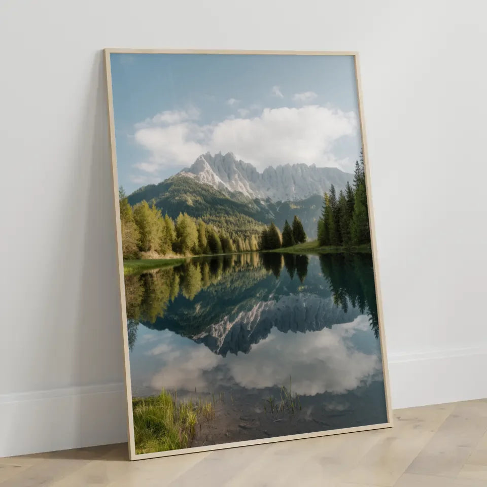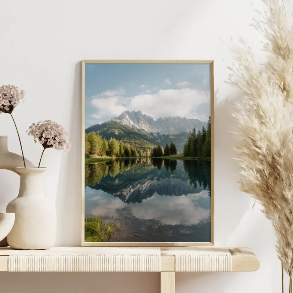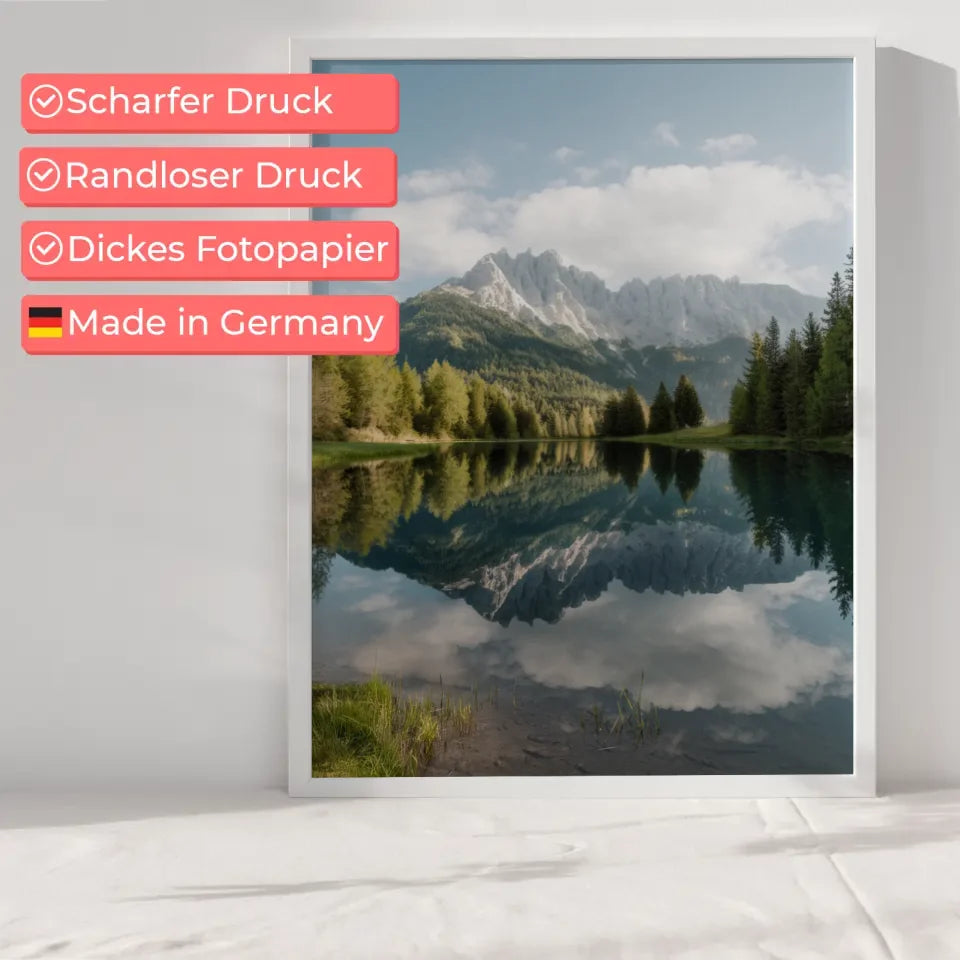 Entdecken Sie unser atemberaubendes Poster, das eine ruhige Landschaft mit einem unberührten See im Vordergrund zeigt. Dieses hochwertige Poster bringt die erfrischende Schönheit der Natur direkt in Ihr Zuhause. Das klare Wasser des Sees spiegelt die friedliche Umgebung wider, einschließlich der üppigen grünen Bäume, die für eine harmonische Atmosphäre sorgen. Die majestätische Bergkette im Hintergrund verleiht diesem Poster eine beeindruckende Tiefe und lädt dazu ein, in die natürliche Ruhe der Szenerie einzutauchen.