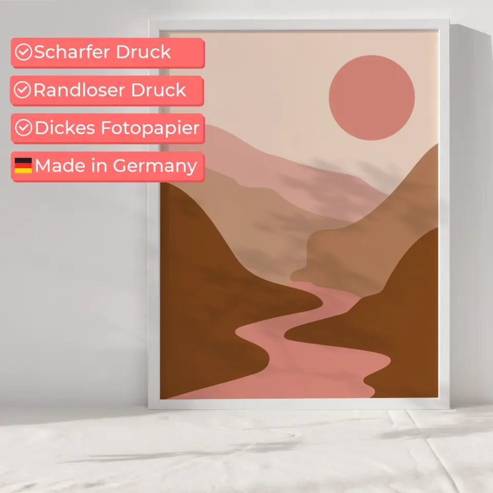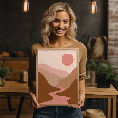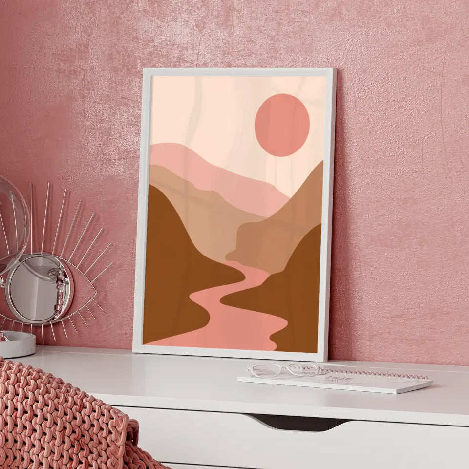 Entdecken Sie unser atemberaubendes Poster, das eine ruhige Landschaftsillustration perfekt einfängt. Dieses einzigartige Kunstwerk zeigt sanfte Hügel und einen gewundenen Fluss, die harmonisch miteinander verbunden sind. Der Himmel strahlt eine sanfte rosa-beige Farbpalette aus, während die große, runde rosa-rote Sonne für einen besonderen Blickfang sorgt.
