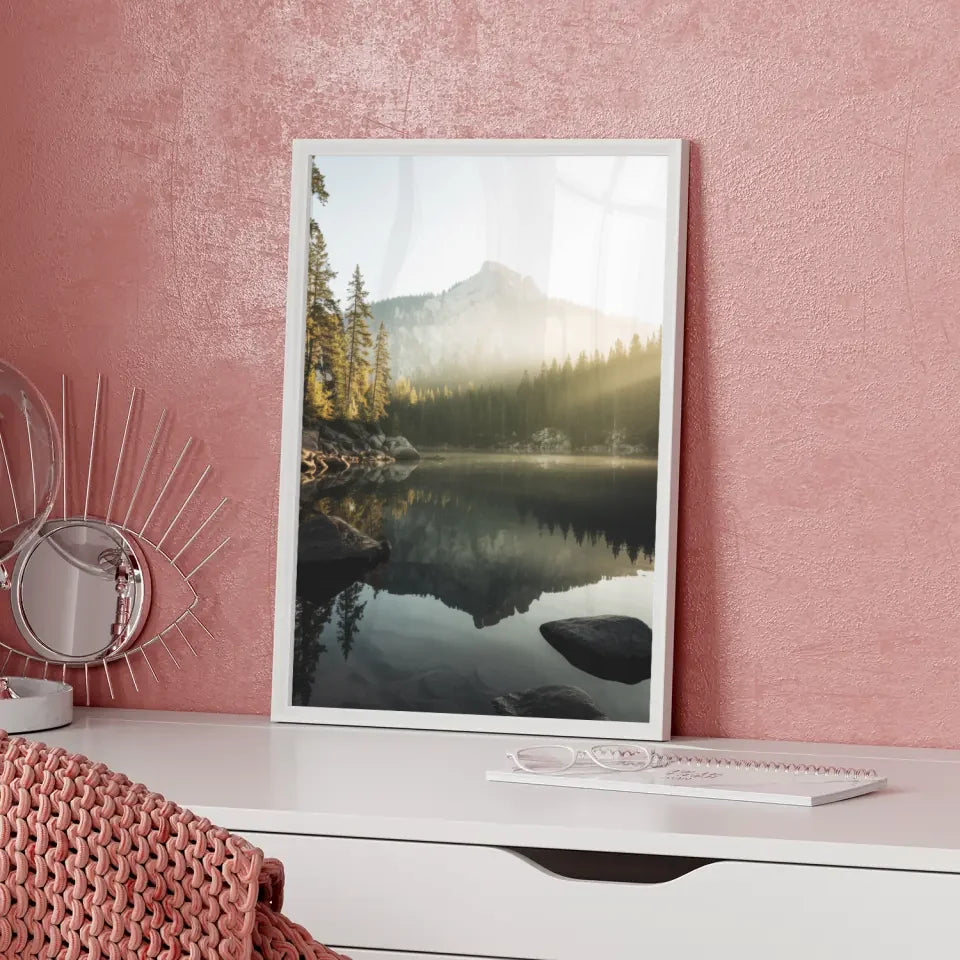 Das ruhige Wasser des Sees, das den Wald um sich herum reflektiert, bringt eine unvergleichliche Ruhe in dein Zuhause. Die Strahlen der Morgensonne, die durch die dichten Kiefern dringen, verleihen dem Poster eine magische Note und erzeugen eine neblige, friedvolle Stimmung. Dieses Wandbild ist mehr als nur ein Poster; es ist eine Einladung zur Entspannung und eine Hommage an die unberührte Schönheit der Natur.