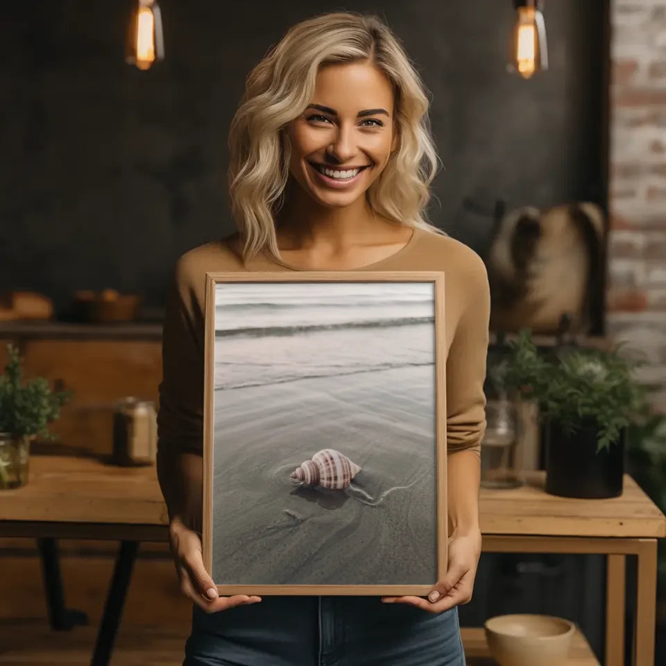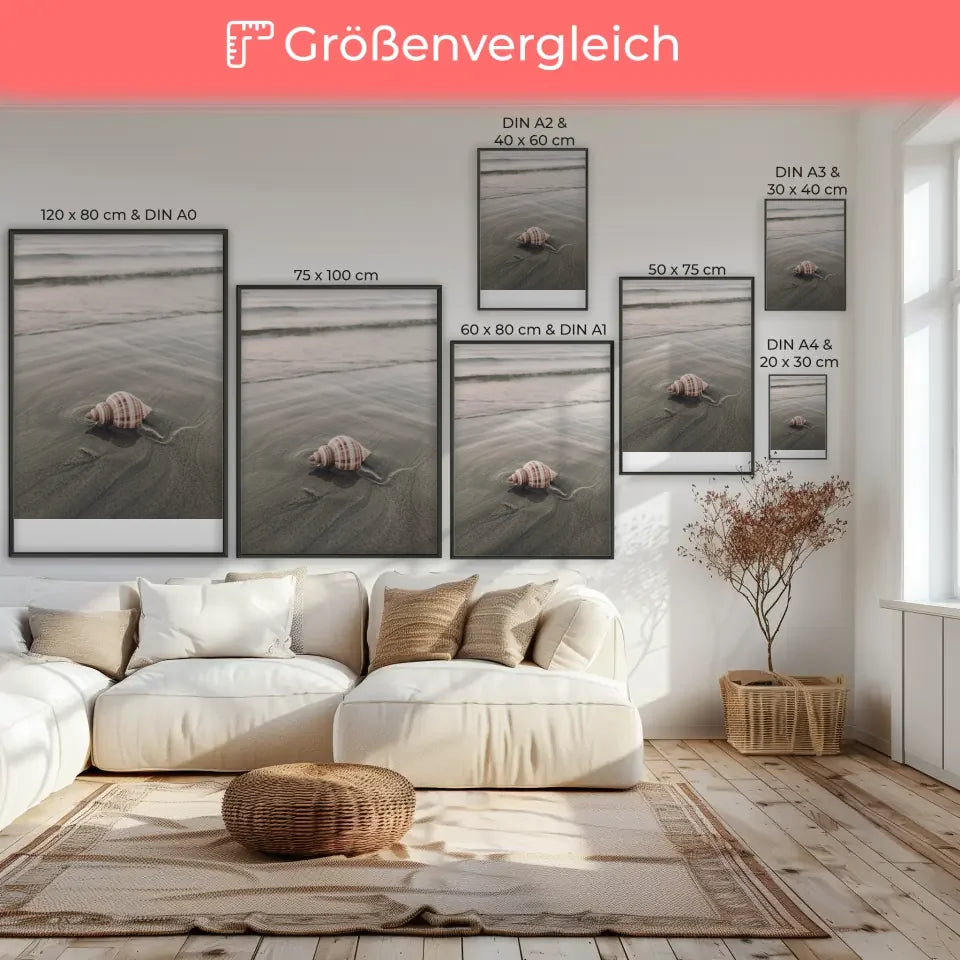 Verleihe deinem Wohnraum eine entspannende Atmosphäre mit unserem atemberaubenden Poster, das eine ruhige Strandszene zeigt. Dieses faszinierende Poster kombiniert sanfte, gedämpfte Farben, die Harmonie und Gelassenheit in jeden Raum bringen. Im Vordergrund prangt eine Kunstvolle Muschel, die auf dem nassen Sand ruht und durch ihr kompliziertes Muster besticht. Diese Muschel spiegelt sanft auf dem Wasser wider und zieht alle Blicke auf sich. Das Poster fängt die Essenz eines perfekten Strandtags ein und vermittelt ein Gefühl der Ruhe und des Friedens.