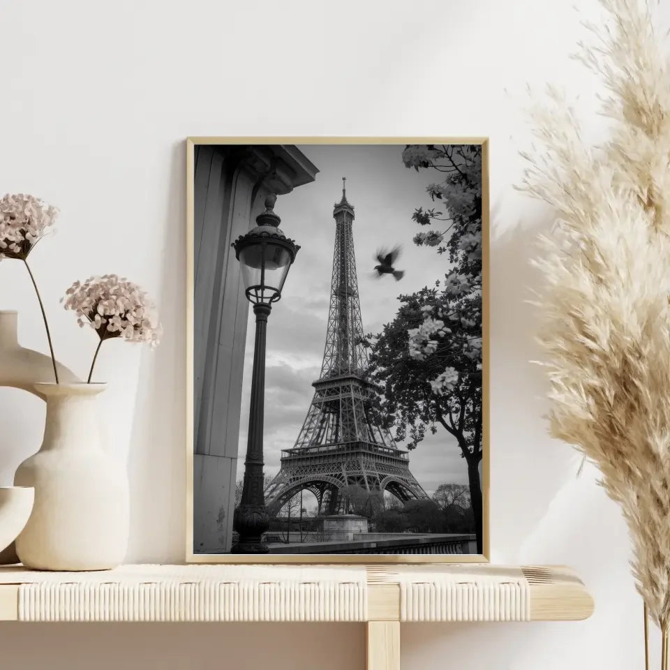 Im Vordergrund des Posters steht ein kunstvoll gestalteter Laternenpfahl, der die nostalgische Atmosphäre perfekt unterstreicht. Rechts im Bild blüht ein Baum mit weißen Blüten, welcher dem Gesamtkunstwerk eine sanfte, romantische Note verleiht. Der fliegende Vogel bringt Dynamik in die Komposition und fängt den Moment eines perfekten Tages in Paris ein.
