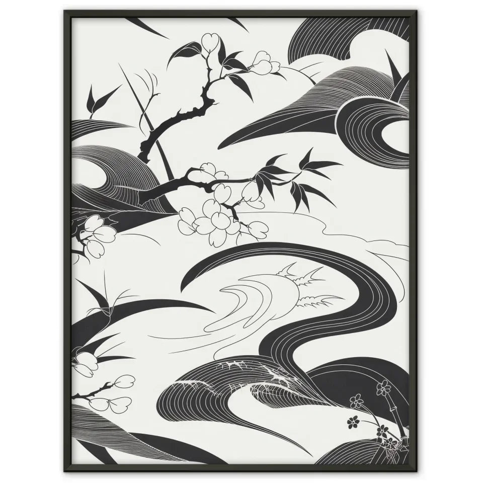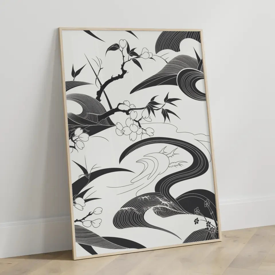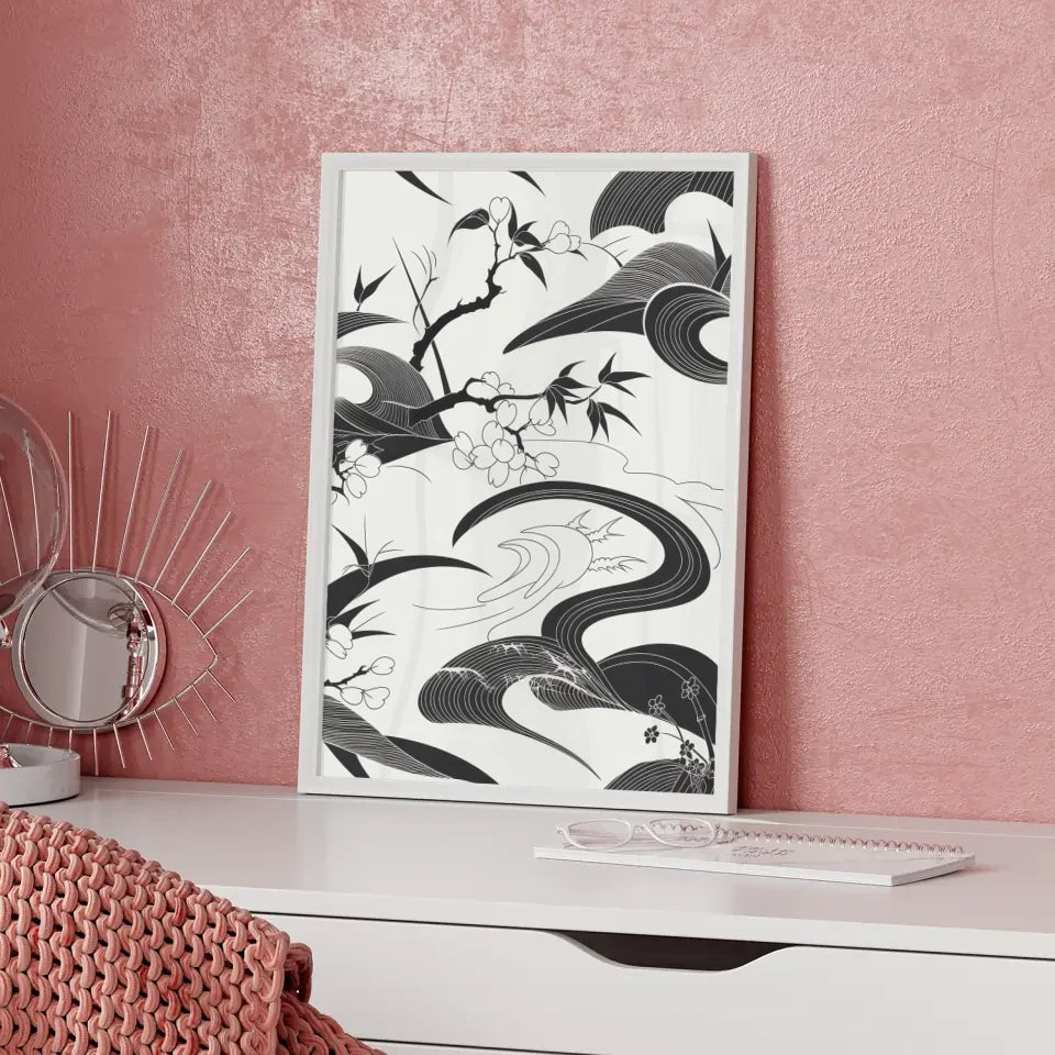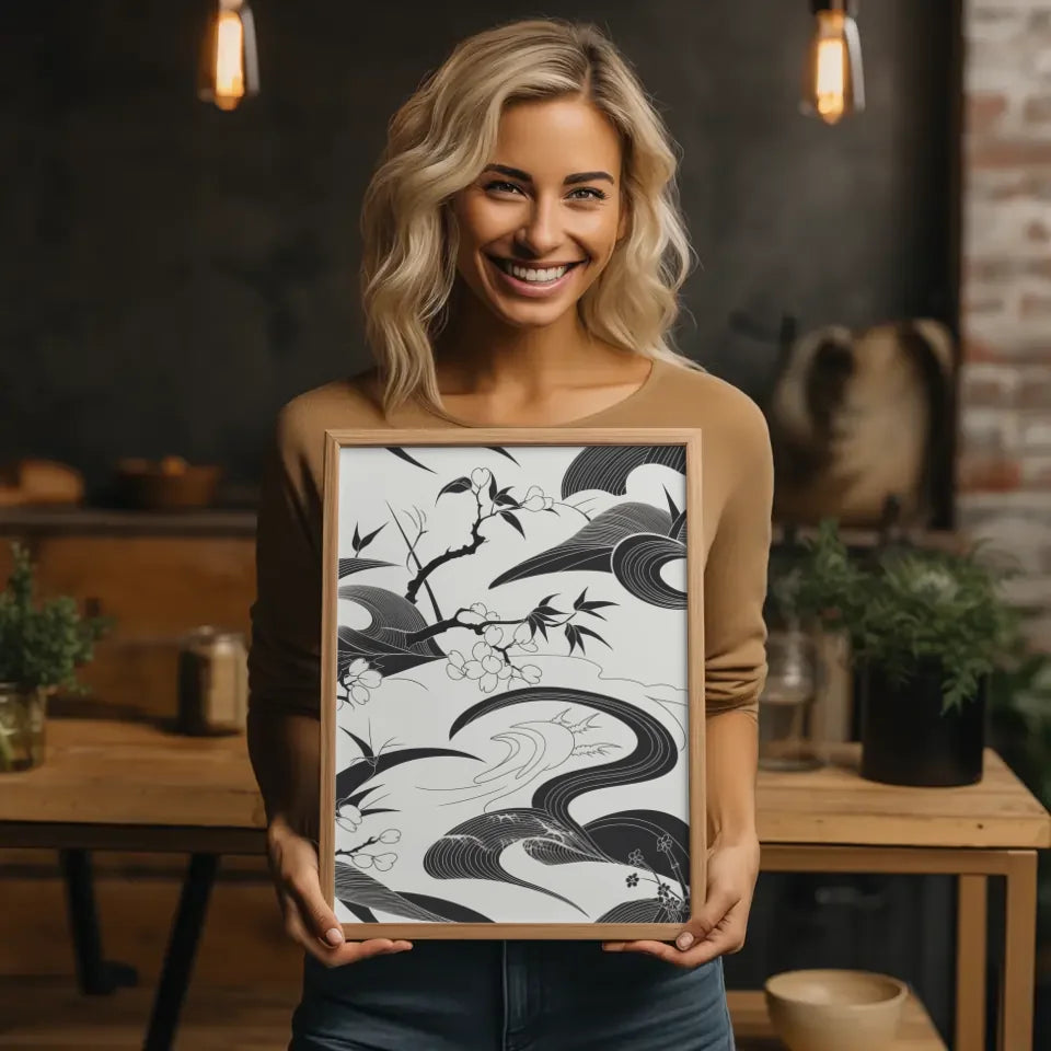 Entdecken Sie unser einzigartiges schwarz-weiß Poster mit japanischem Kunstmuster, das jedem Raum eine elegante Note verleiht. Dieses Kunstwerk kombiniert komplizierte, fließende Linien und Formen, die an traditionelle japanische Kalligraphie und Holzschnitte erinnern, jedoch mit einem modernen Touch. Das Poster umfasst abstrakte Elemente wie Kirschblüten, Bambus und Wellen, die harmonisch miteinander verwoben sind und ein Gefühl von Gelassenheit und Ruhe vermitteln.