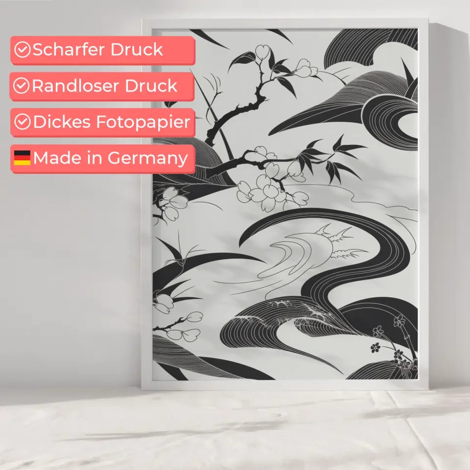 Unsere Poster sind nicht nur Dekoration, sondern eine stilvolle Möglichkeit, Ihr Zuhause oder Büro zu bereichern. Das ausgewogene Design macht dieses Schwarz-weiß Poster zur idealen Wahl für Liebhaber der japanischen Kunst und Ästhetik. Verleihen Sie Ihrem Wohnraum eine besondere Atmosphäre und schaffen Sie einen Rückzugsort, der zum Entspannen einlädt.