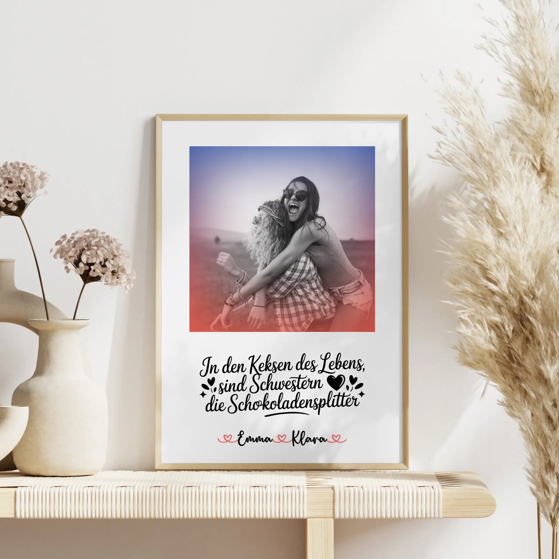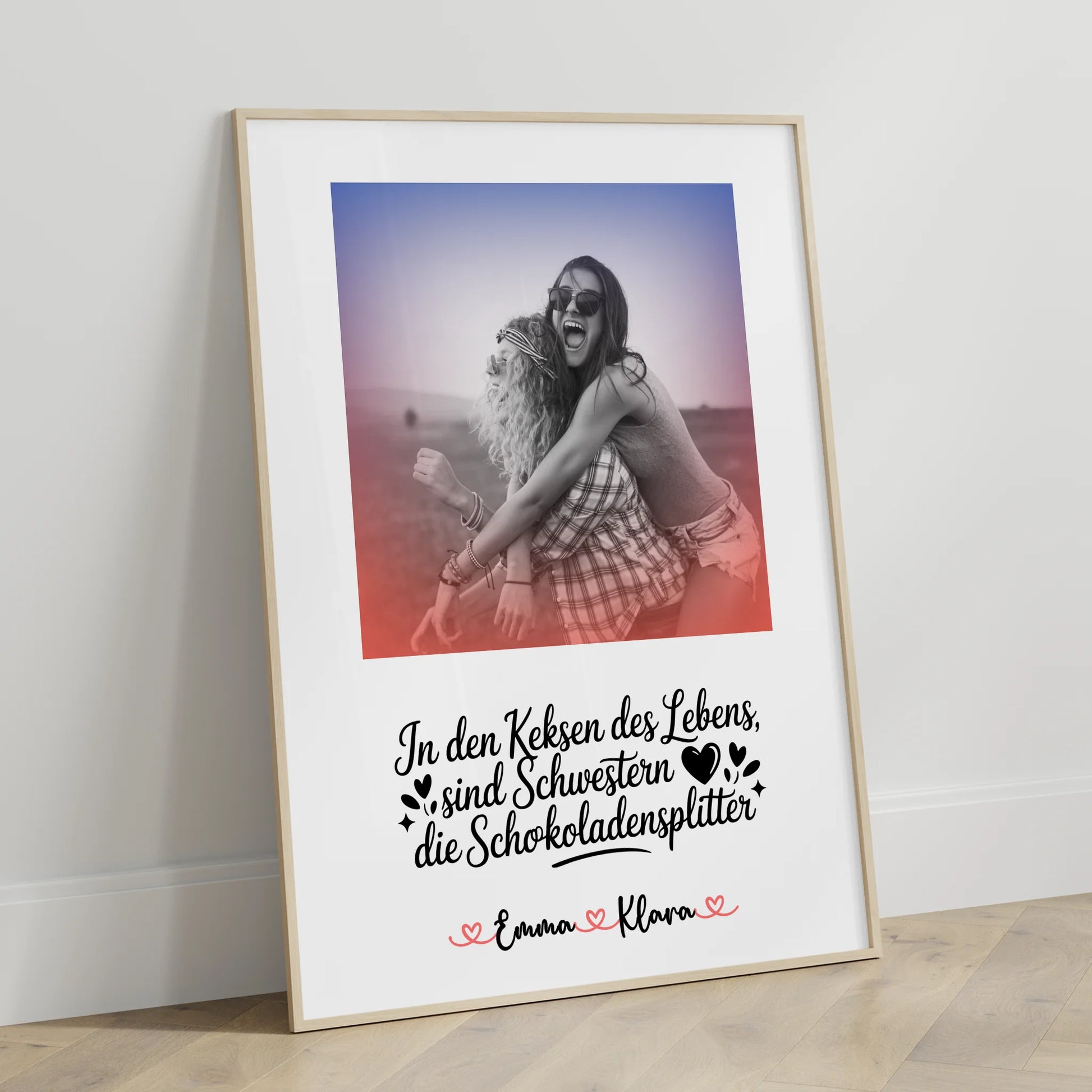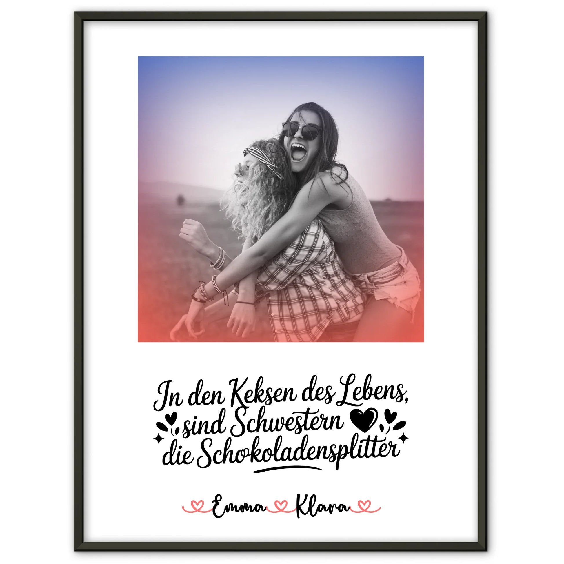 Du erhältst ein langlebiges Poster mit brillanten Farben oder klassischem Schwarz & Weiß, gestochen scharfer Druckqualität und flexiblen Größen. Die individuelle Gestaltung macht das Geschenk besonders persönlich und zeigt deiner Schwester wie wichtig sie dir ist. Perfekt für Geburtstage und bleibende Erinnerungen.