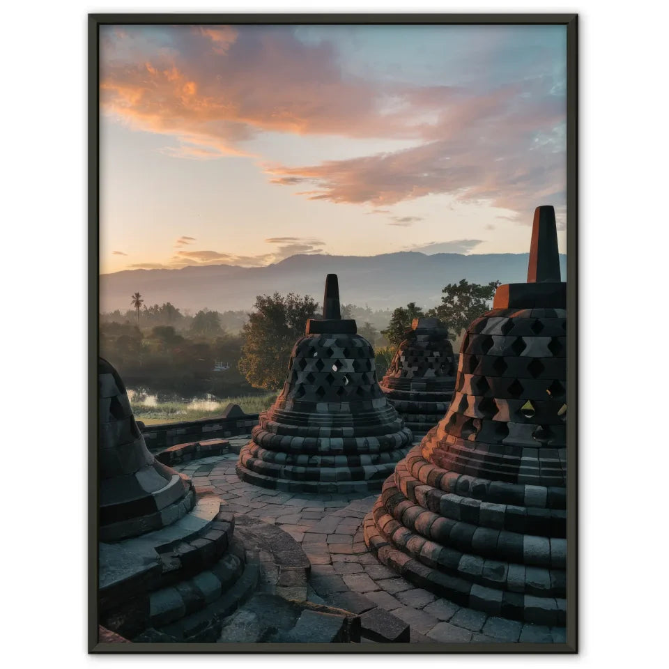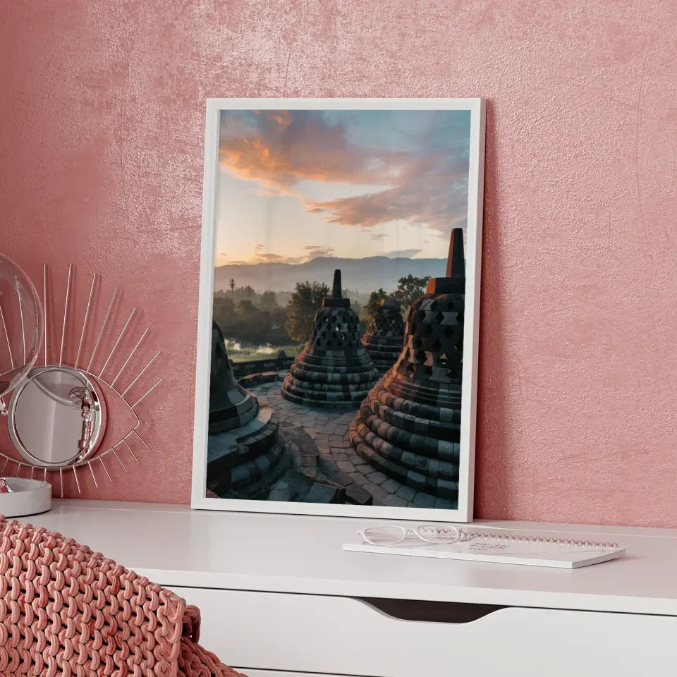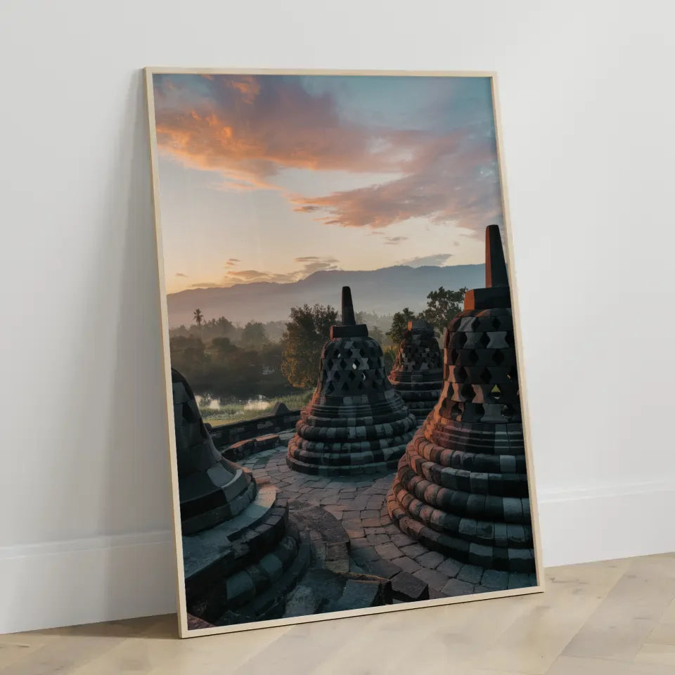 Hochwertig gedruckt und in verschiedenen Größen verfügbar, ermöglicht unser Poster Borobudur Indonesien Panoramafoto zur Golden Hour eine individuelle Gestaltung, die Ihren persönlichen Stil widerspiegelt. Bringen Sie die Schönheit Indonesiens in Ihre vier Wände und verwandeln Sie Ihre Umgebung in eine Oase der Ruhe und Inspiration.