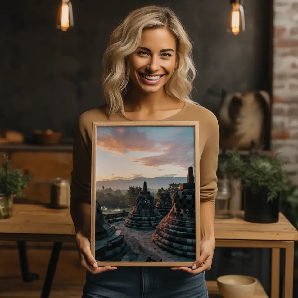 Ein Poster ist mehr als nur Dekoration – es ist ein Fenster in eine andere Welt. Mit diesem Poster holen Sie sich ein Stück Indonesien in Ihr Zuhause. Das lichtdurchflutete Panoramafoto zeigt die monumentalen Stufen des Borobudur in harmonischer Wechselwirkung mit dem warmen, golden schimmernden Licht der Abenddämmerung, das die Details der Tempelanlage perfekt zur Geltung bringt.