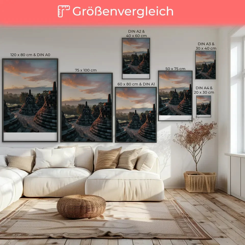 Erleben Sie die atemberaubende Schönheit der indonesischen Kultur mit unserem exklusiven Poster Borobudur Indonesien Panoramafoto zur Golden Hour. Dieses beeindruckende Wandbild fängt die magischen Farben und die einzigartige Atmosphäre des weltberühmten Borobudur-Tempels während der goldenen Stunde ein.