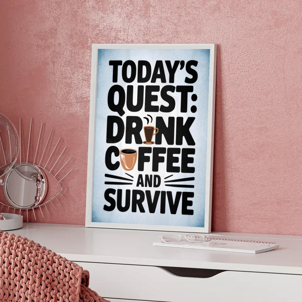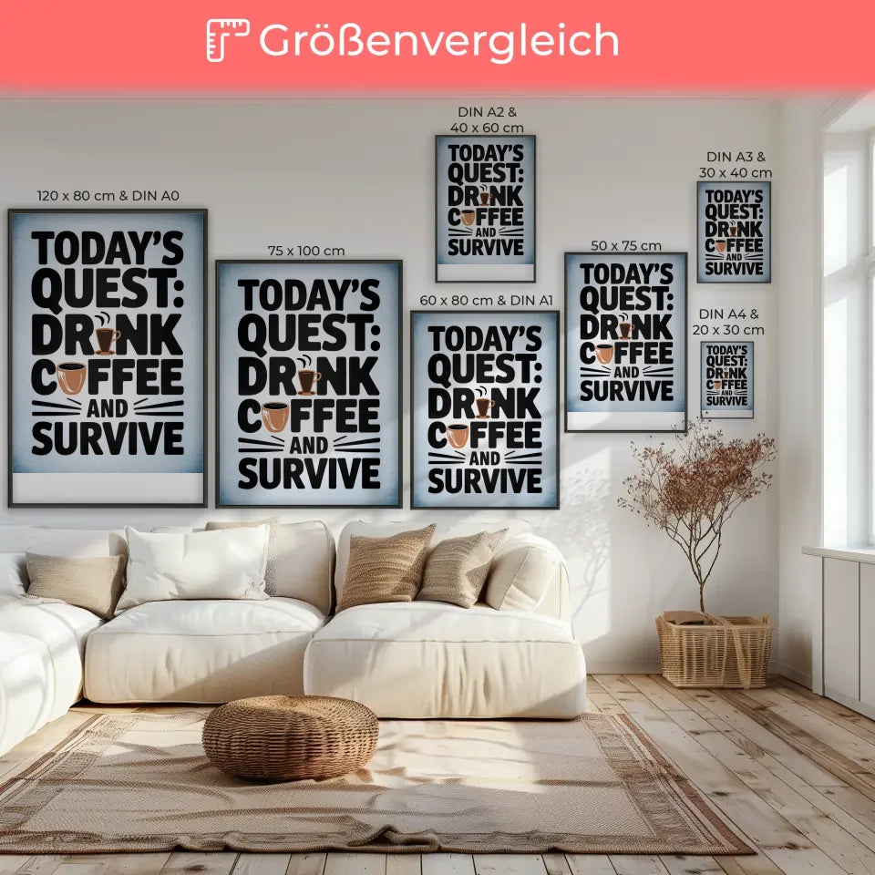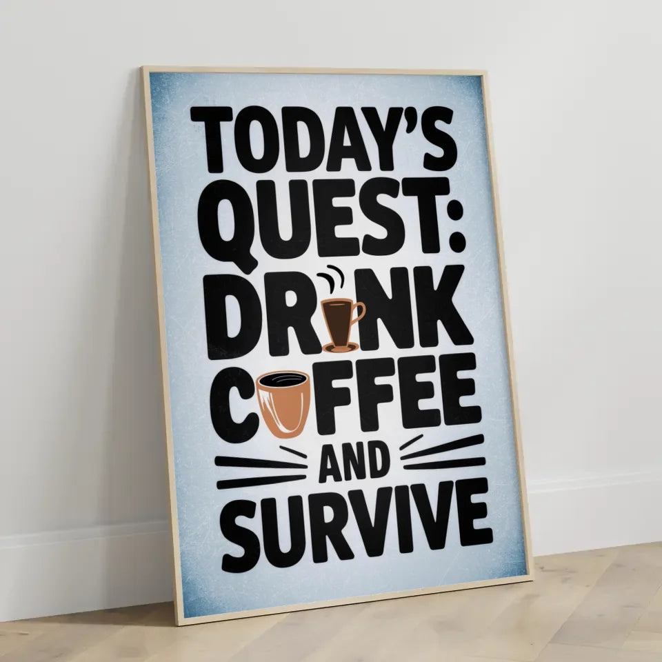 Entdecken Sie unser einzigartiges skurriles Poster Kaffee Quest, das mit witziger Typografie und lebendigen Farben begeistert. Dieses Poster ist perfekt für jeden Raum, der eine Prise Humor und Motivation benötigt. Der fettgedruckte Text Today's Quest: Drink Coffee and Survive“ sorgt nicht nur für Schmunzeln, sondern erinnert Sie auch daran, wie wichtig Kaffee in unserem Alltag ist.