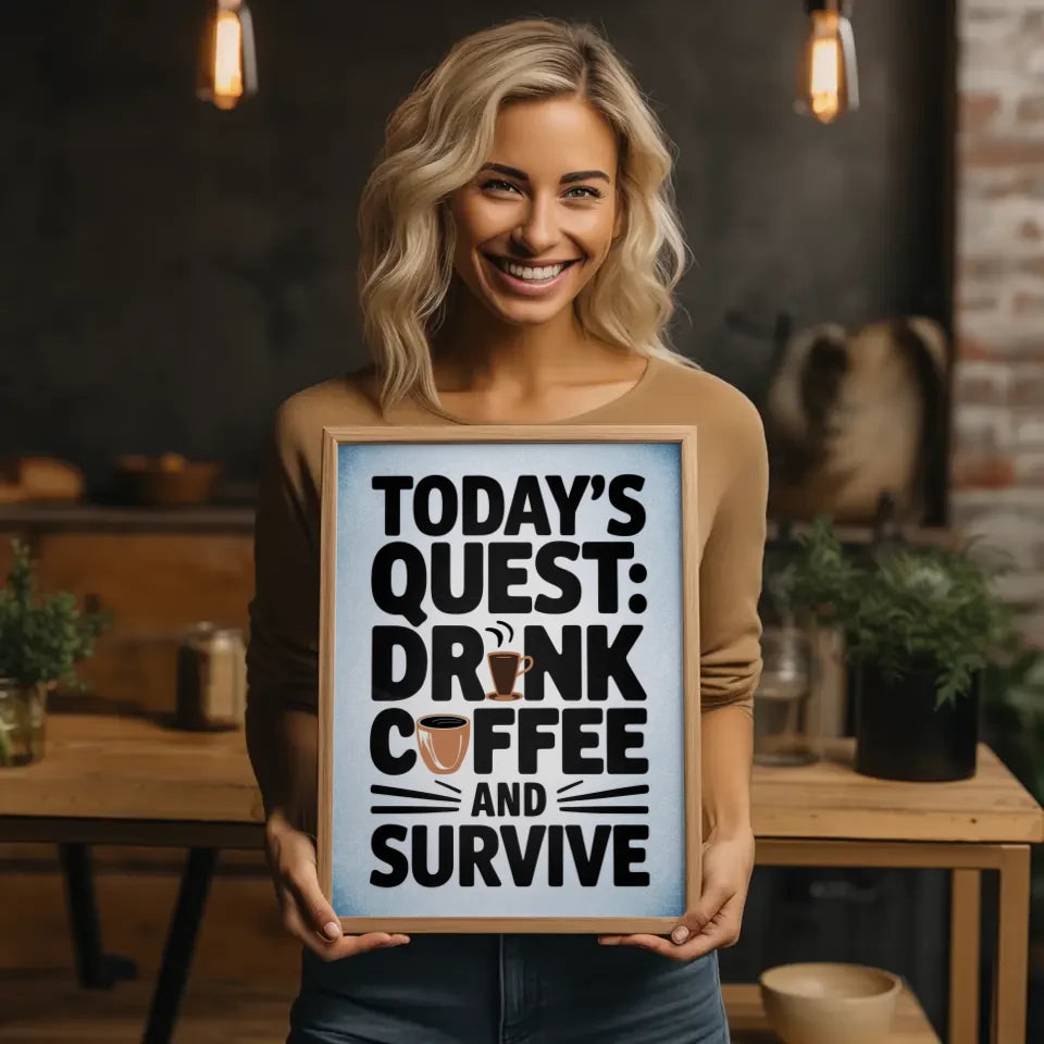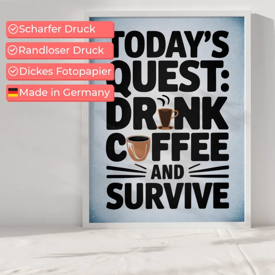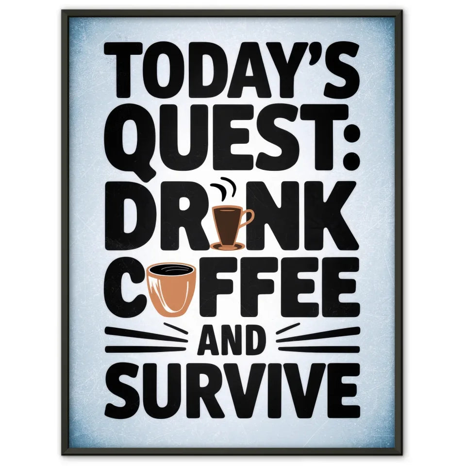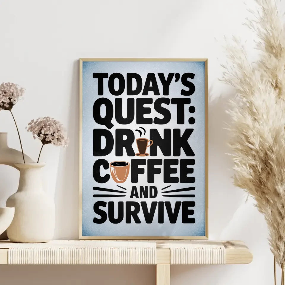Entdecken Sie unser einzigartiges skurriles Poster Kaffee Quest, das mit witziger Typografie und lebendigen Farben begeistert. Dieses Poster ist perfekt für jeden Raum, der eine Prise Humor und Motivation benötigt. Der fettgedruckte Text Today's Quest: Drink Coffee and Survive“ sorgt nicht nur für Schmunzeln, sondern erinnert Sie auch daran, wie wichtig Kaffee in unserem Alltag ist.