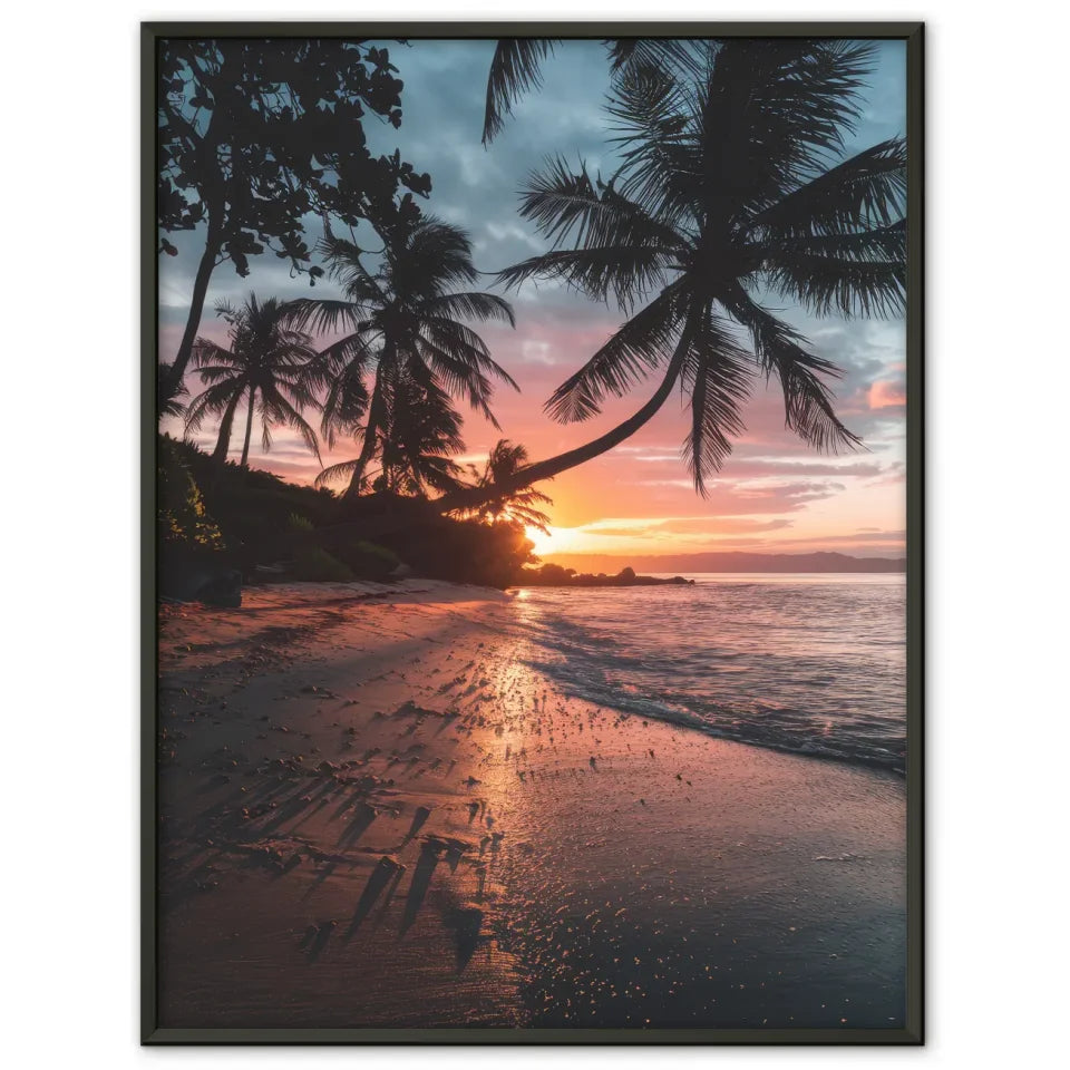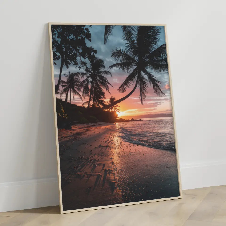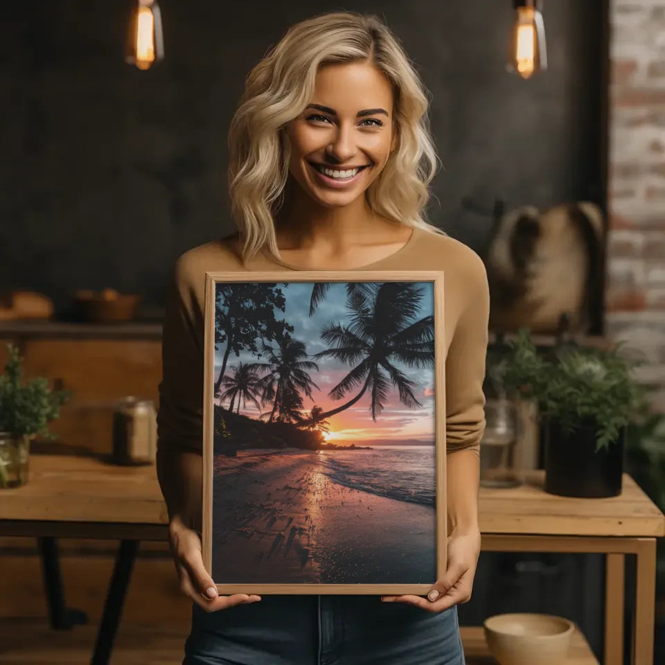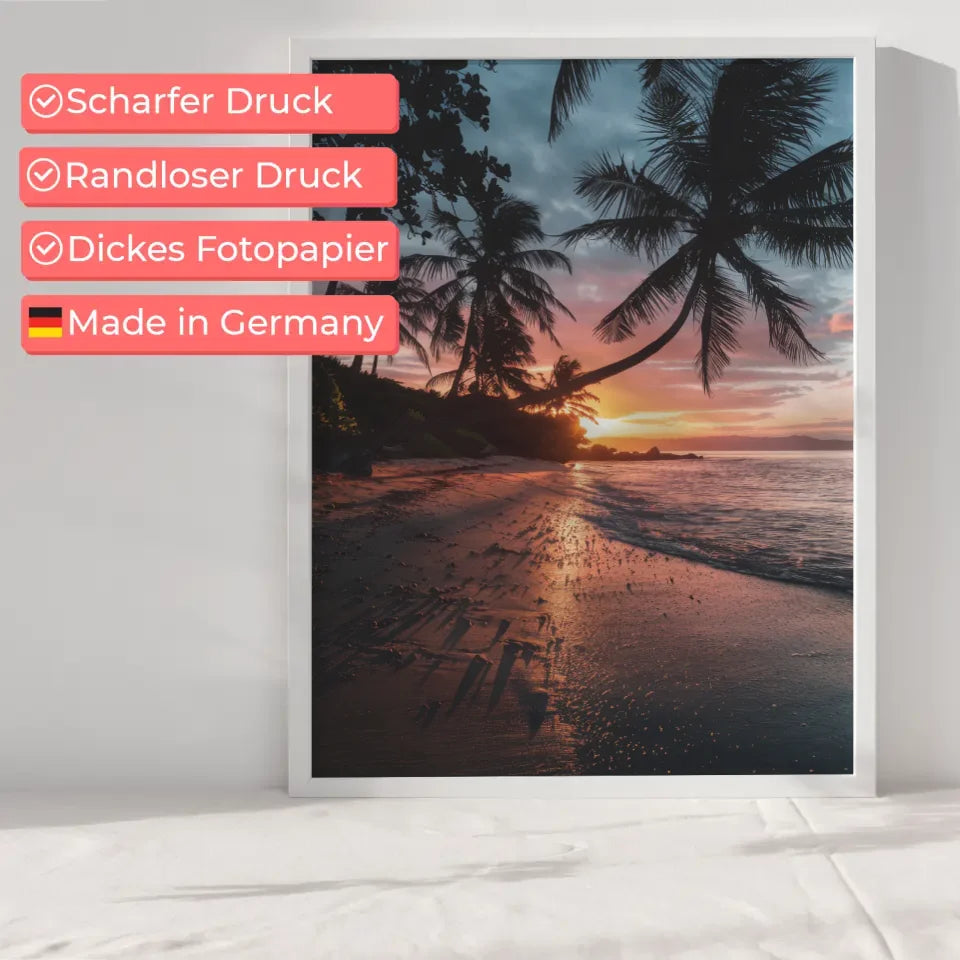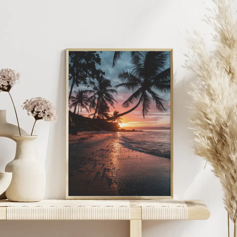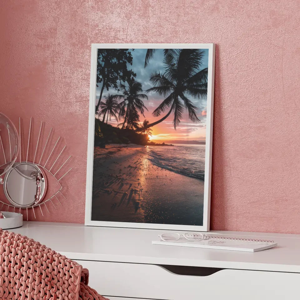 Entdecken Sie unser atemberaubendes Sonnenuntergang Poster Kalifornien mit Palmen und Strandmotiven, das das Paradies direkt in Ihr Zuhause bringt. Dieses exquisite Poster zeigt die majestätische Schönheit eines kalifornischen Strandes, während die Sonne hinter dem Horizont untergeht und den Himmel in ein warmes Orange-Rosa taucht. Die Silhouetten der Palmen verleihen dem Bild eine tropische Note und werfen filigrane Schatten auf den Strand, der mit Kieselsteinen und Muscheln geschmückt ist.