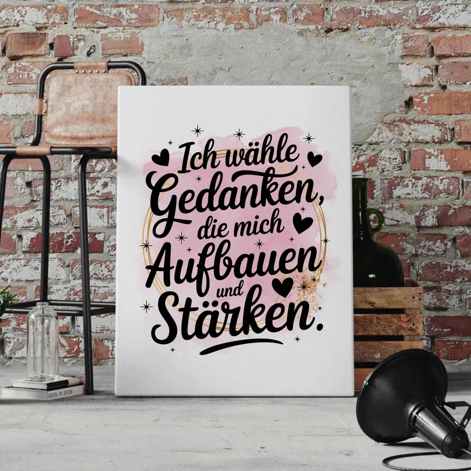 Warte nicht länger! Gestalte jetzt deine individuelle Sprüche Leinwand Affirmation 'Ich wähle Gedanken, die mich aufbauen und stärken' und schaffe dir einen Raum voller positiven Vibes!