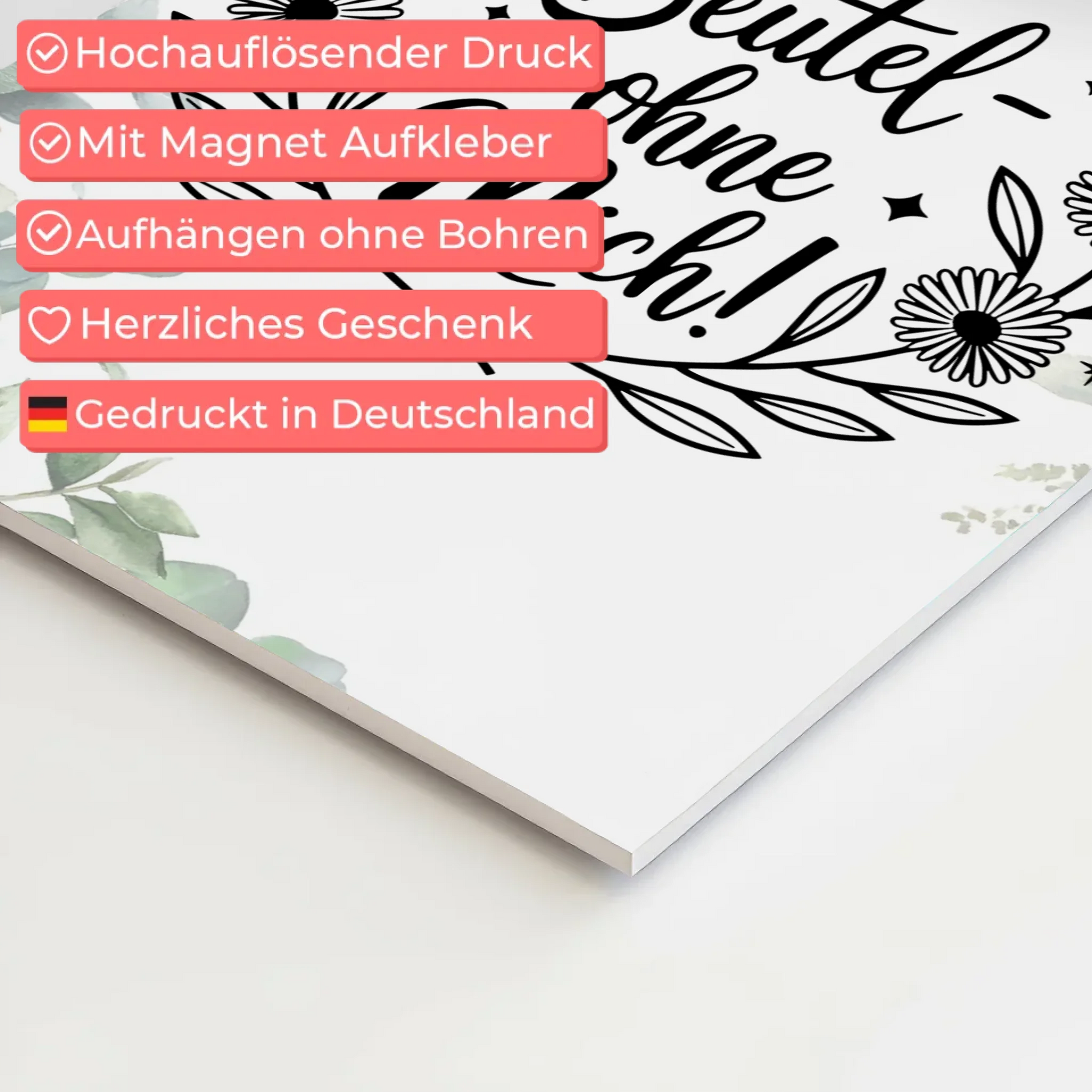Entdecke das einzigartige Sprüche Poster Magentisch ohne Beutel ohne mich Geschenk, das sich perfekt für jeden Anlass eignet! Dieses personalisierbare Magnet Poster Fotoboard mit Spruch ist die ideale Geschenkidee, um deinen Liebsten eine Freude zu bereiten. Gestalte dein eigenes Magnet Poster Fotoboard mit Spruch selbst gestalten und wähle ein Hintergrundbild, das deine persönliche Note unterstreicht.