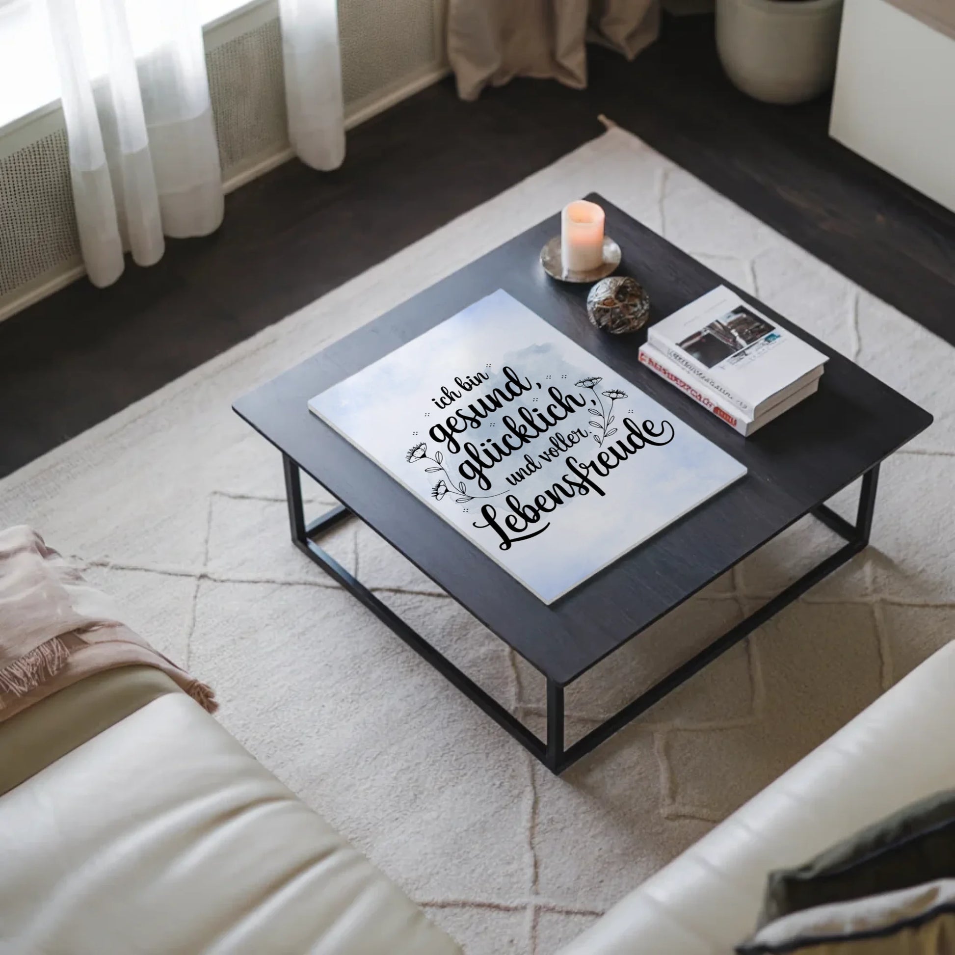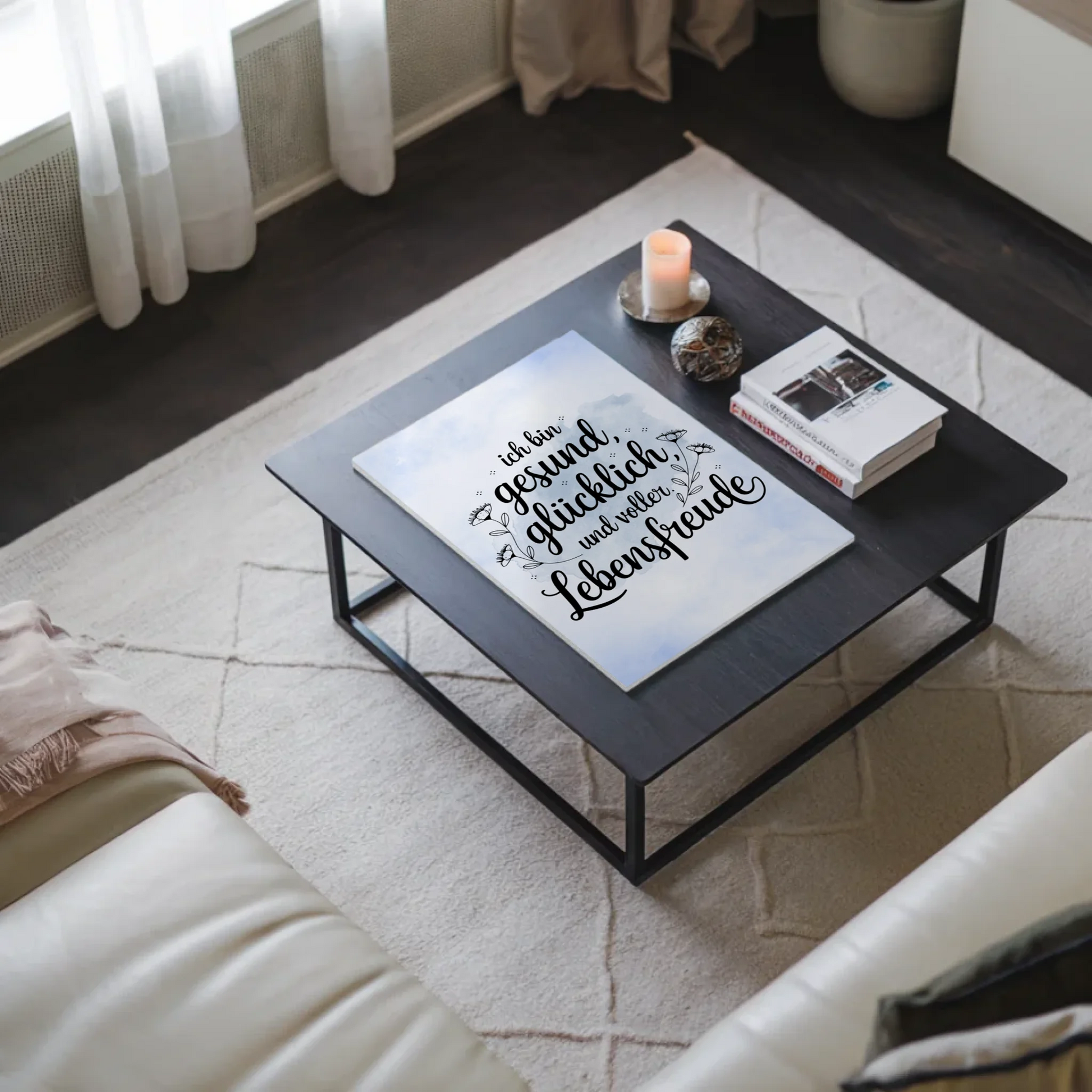 Entdecke das einzigartige Sprüche Poster Magnetisch Affirmation Ich bin gesund glücklich, das perfekt für jeden Anlass geeignet ist. Dieses personalisierbare Geschenk bietet dir die Möglichkeit, das Hintergrundbild nach deinen Wünschen zu gestalten und so ein individuelles Kunstwerk zu schaffen.